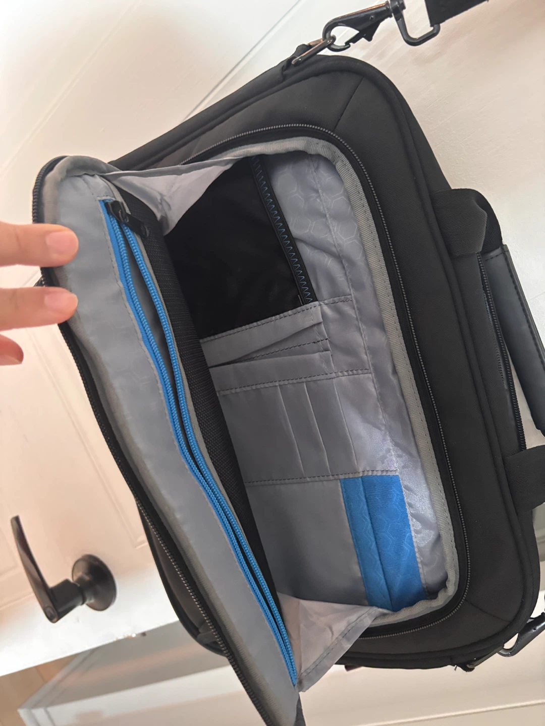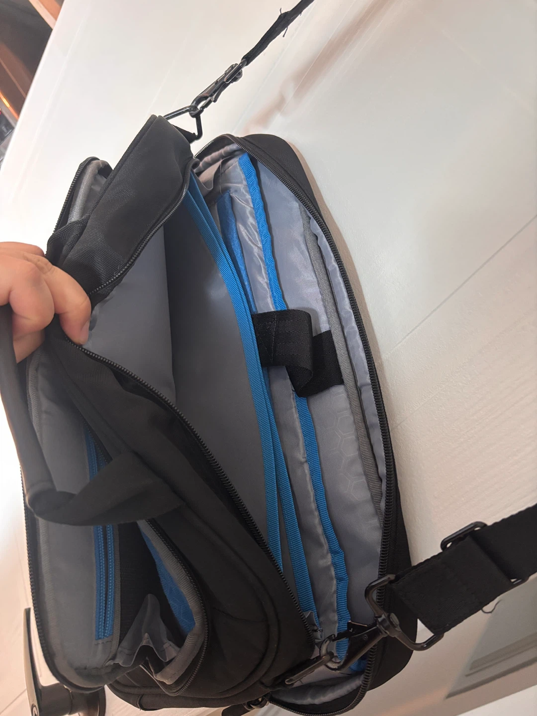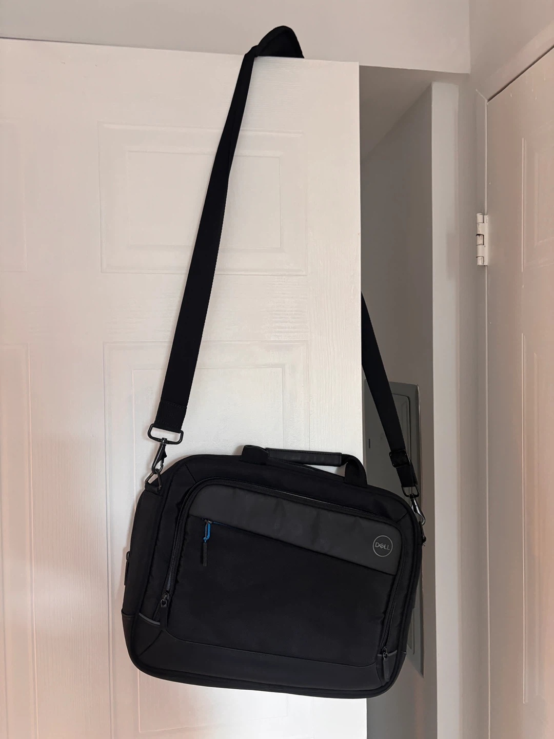 Black Dell laptop bag with multiple compartments and adjustable shoulder strap. It's made from durable nylon material. Plenty of pockets for organization!