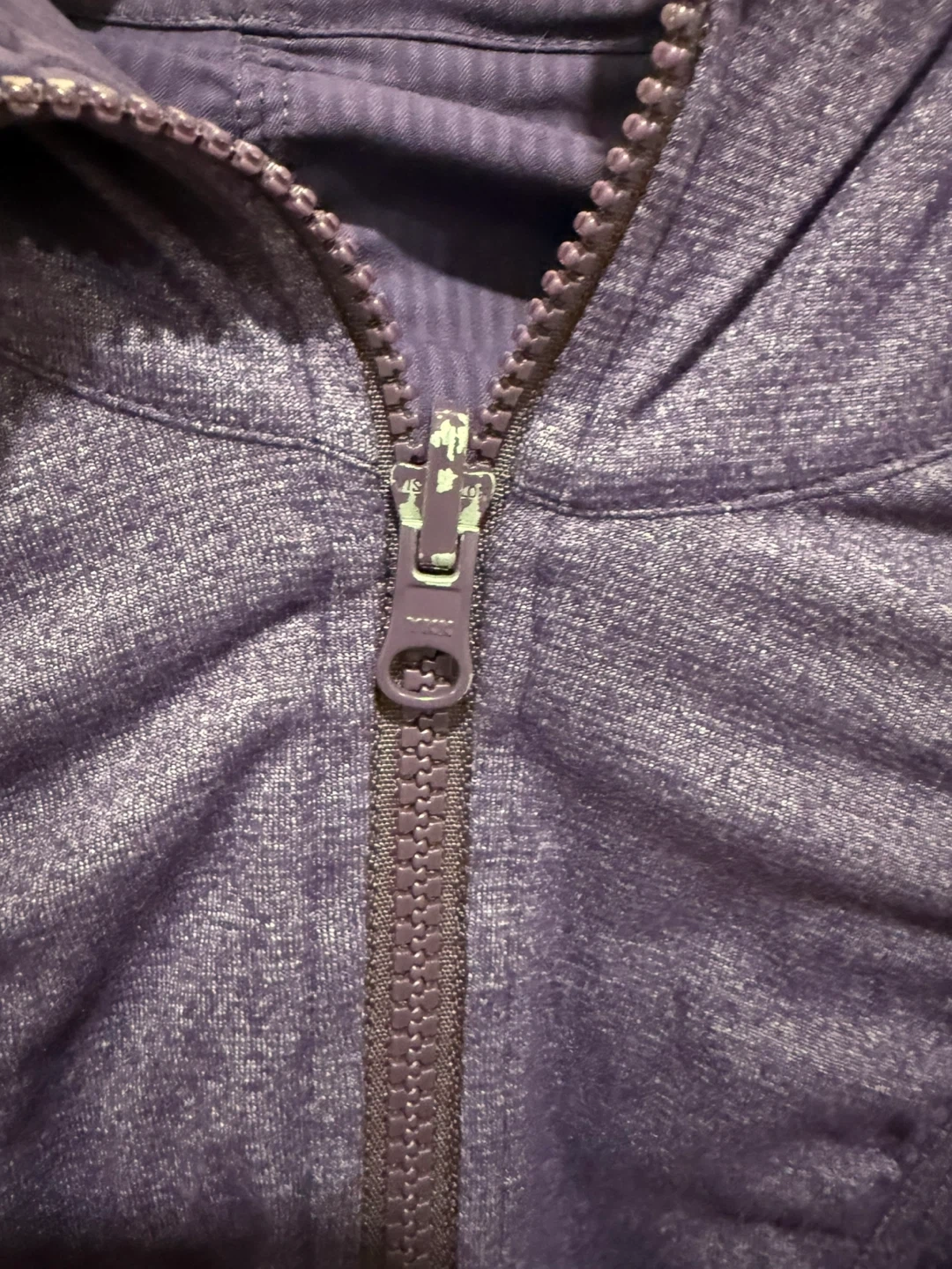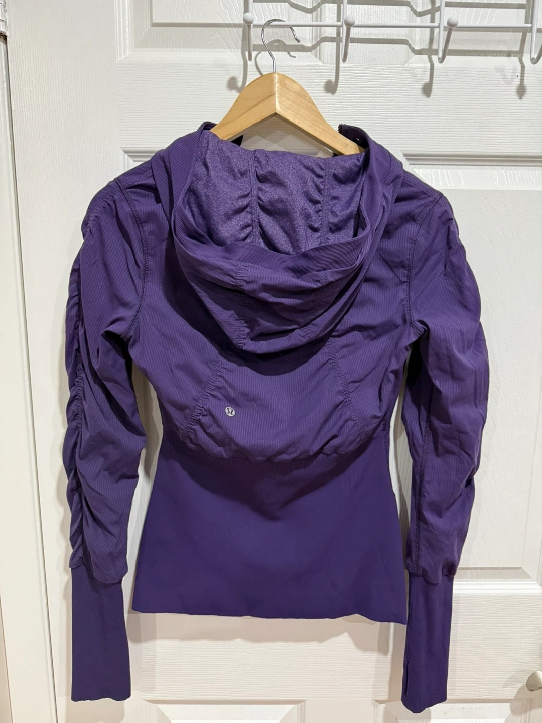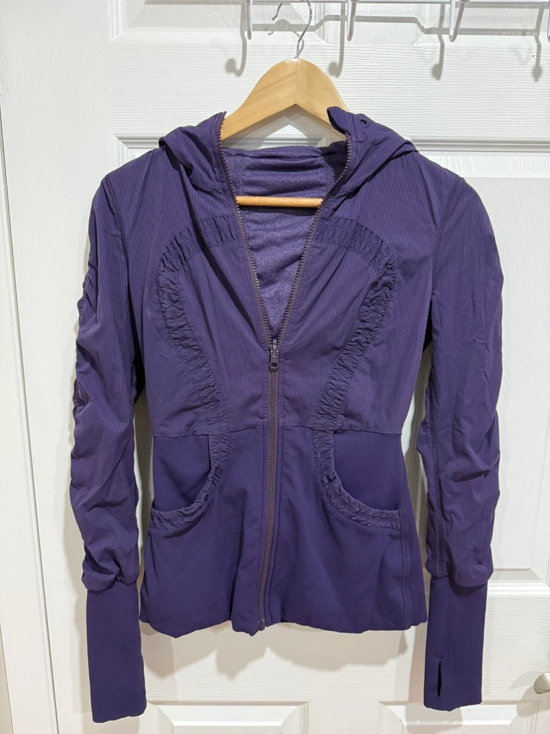 Flattering and functional Lululemon women’s zip-up jacket in a rich purple shade. Designed with contoured seams that shape the waist, a lightweight technical fabric, and a hooded silhouette that’s perfect for layering.