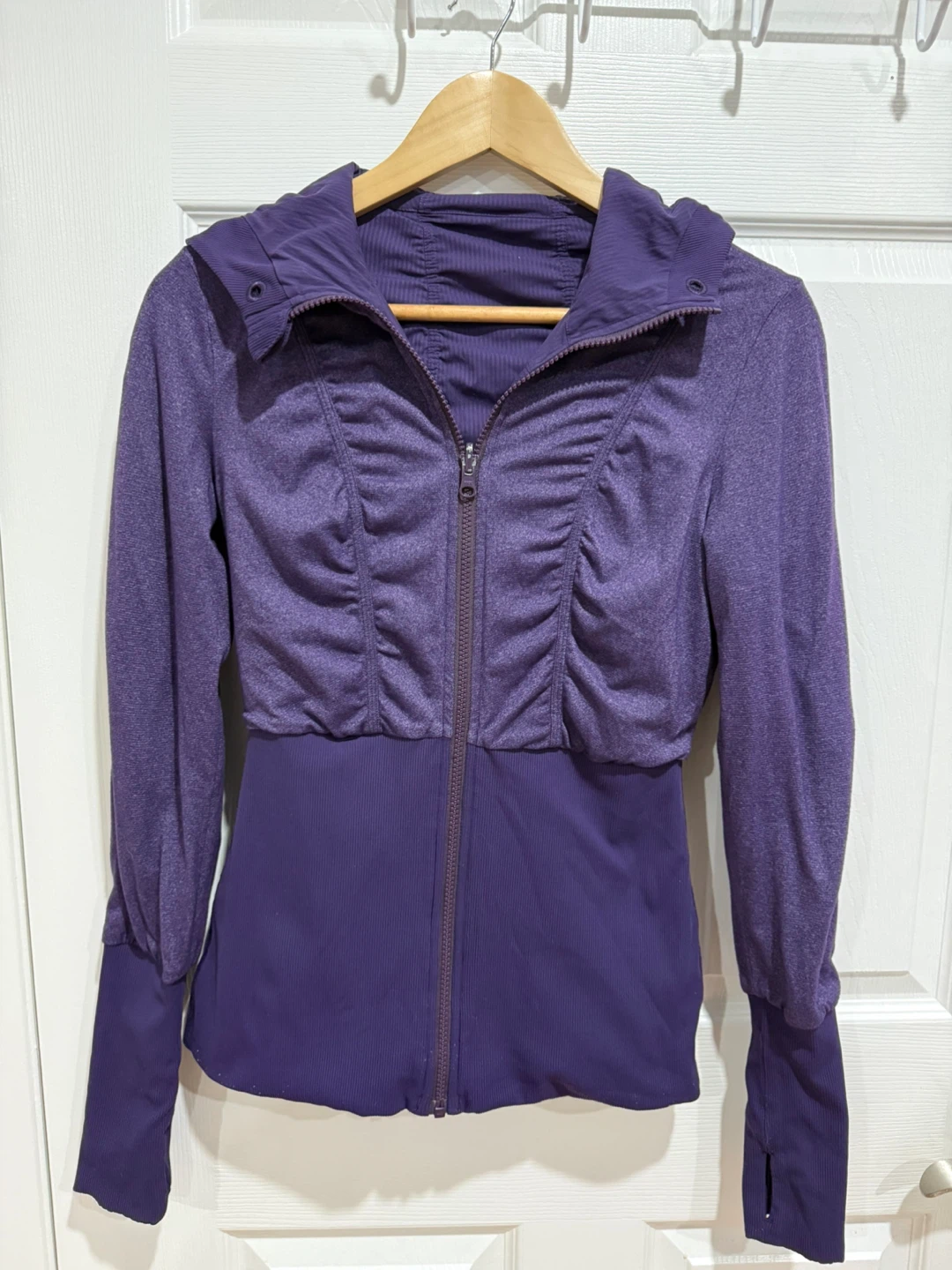 Flattering and functional Lululemon women’s zip-up jacket in a rich purple shade. Designed with contoured seams that shape the waist, a lightweight technical fabric, and a hooded silhouette that’s perfect for layering.