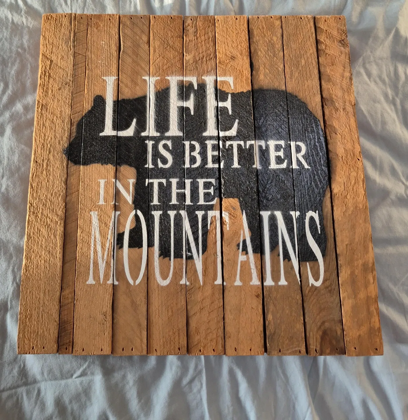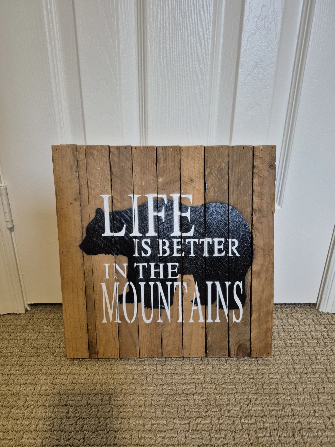 Rustic wooden wall sign featuring a black bear silhouette and white text that reads 'LIFE IS BETTER IN THE MOUNTAINS'. It's made of assembled wooden planks. This sign would be a nice addition to a cabin or nature-themed decor.