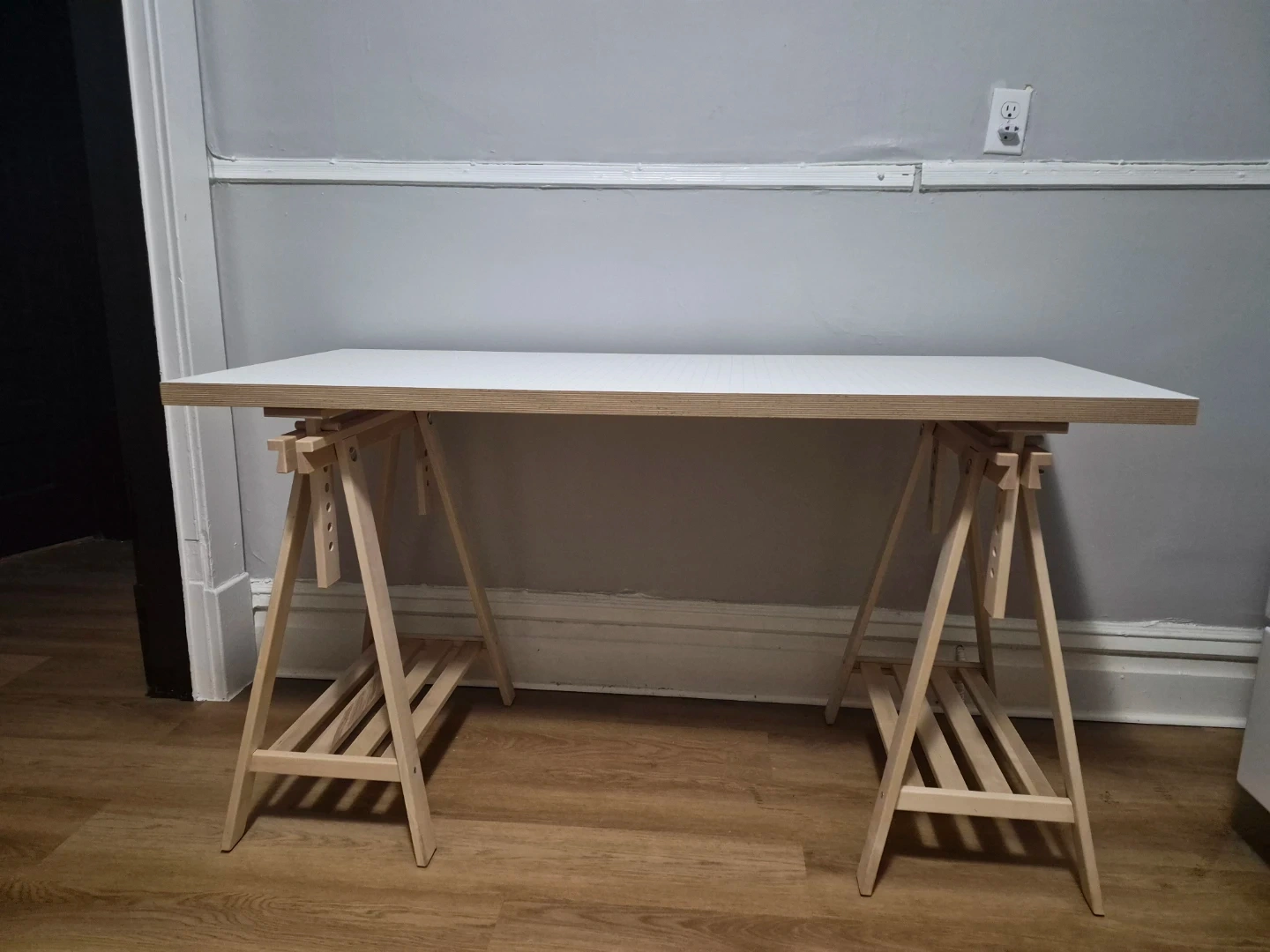This IKEA drawing desk offers a spacious white tabletop and a sturdy wooden trestle base. It's adjustable in height, making it suitable for various projects. The trestles include shelves for convenient storage. White tabletop and natural wood frame.