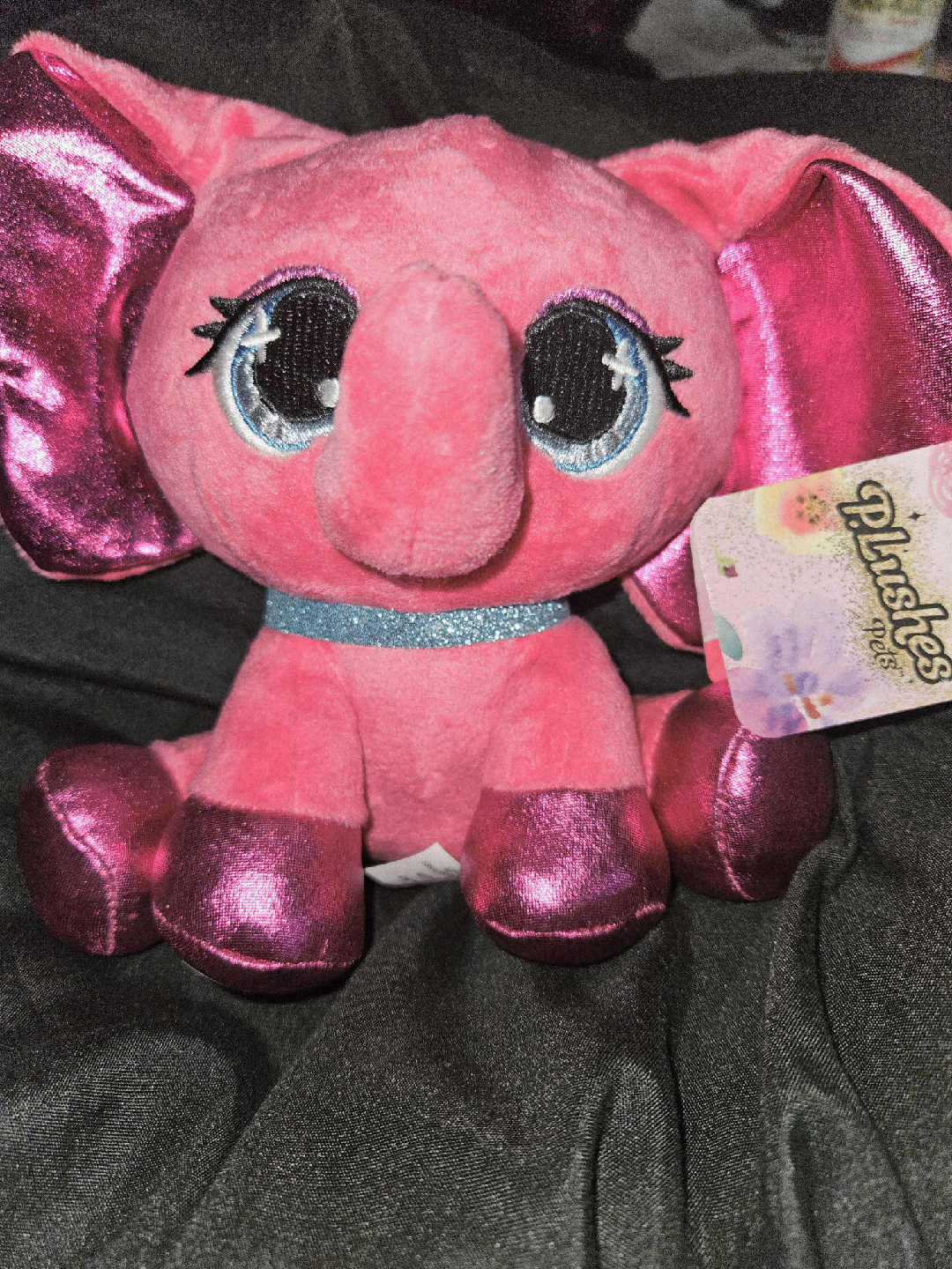 This is a cute pink elephant plush from Plushes Pets! It has sparkly ears and feet, and a sparkly blue collar. It's in great condition and ready for a new home.