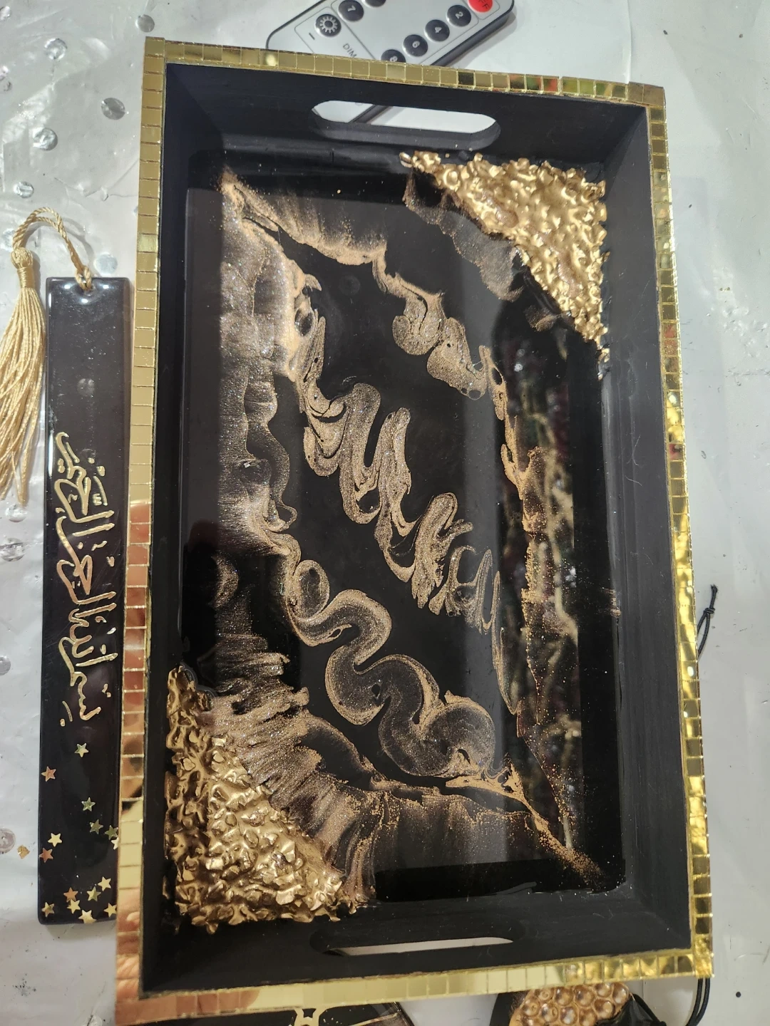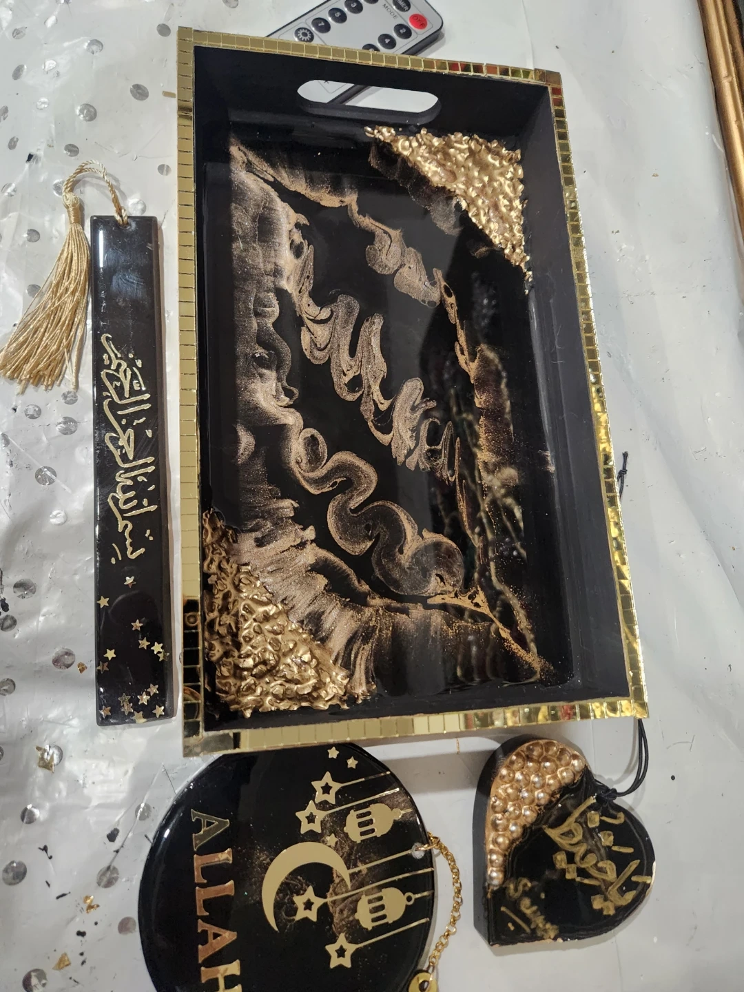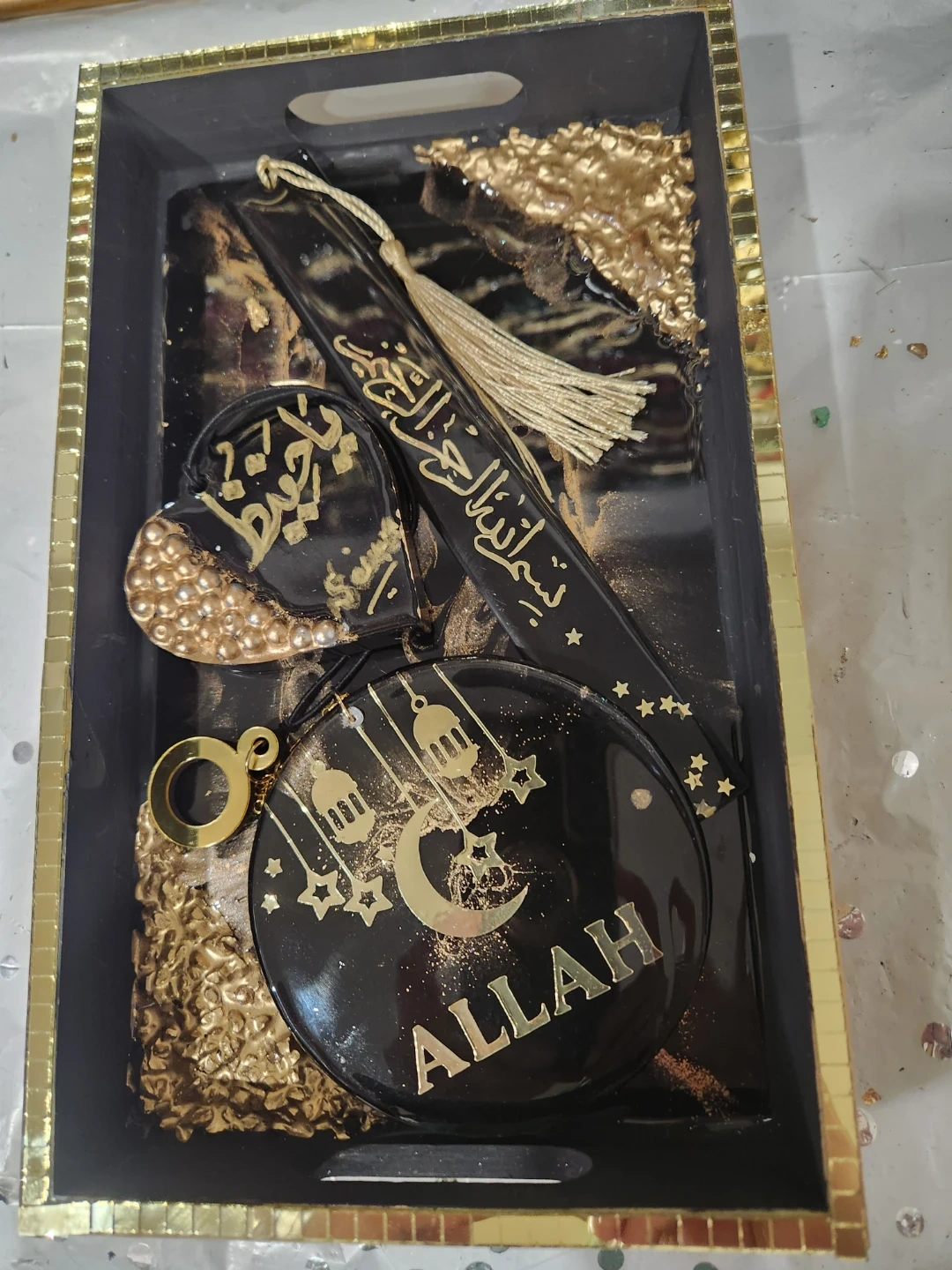 This decorative set includes a serving tray, a bookmark, and a keychain, all featuring a black and gold Islamic design. The tray has gold mosaic trim, and the bookmark and keychain have Arabic calligraphy and Islamic motifs. It's a unique collection for home decor or gifting! door pickup, cash only