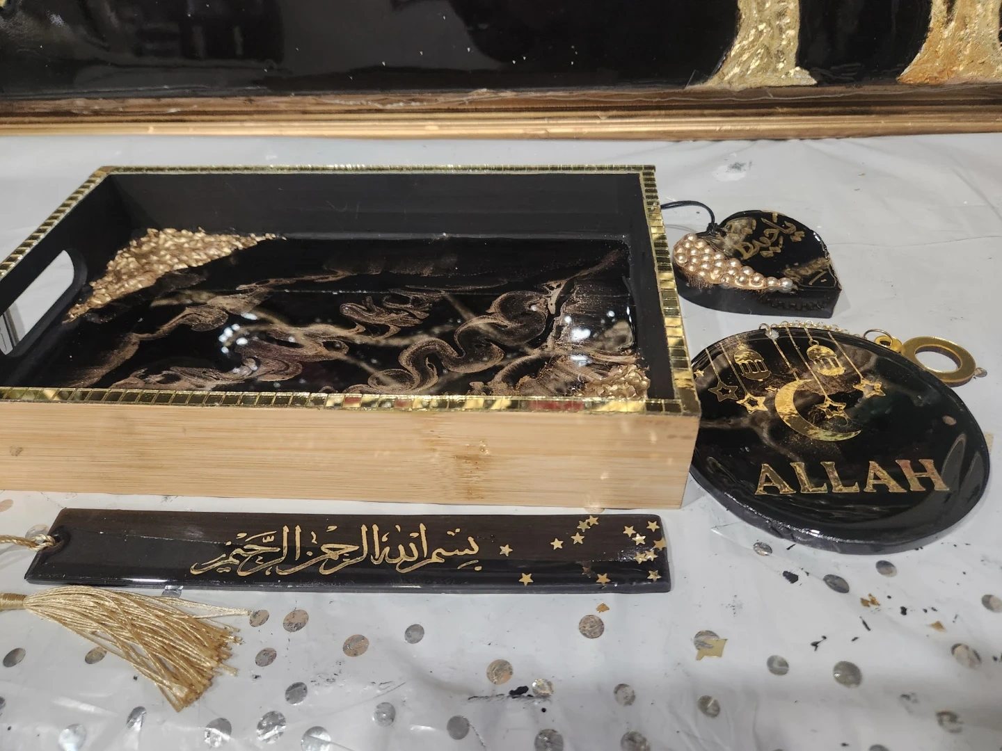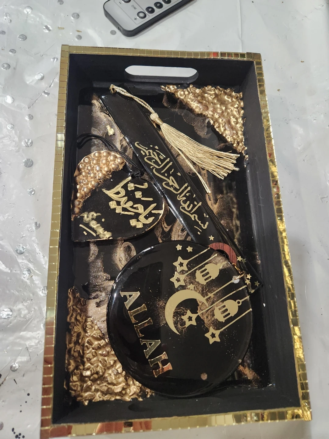 This decorative set includes a serving tray, a bookmark, and a keychain, all featuring a black and gold Islamic design. The tray has gold mosaic trim, and the bookmark and keychain have Arabic calligraphy and Islamic motifs. It's a unique collection for home decor or gifting! door pickup, cash only