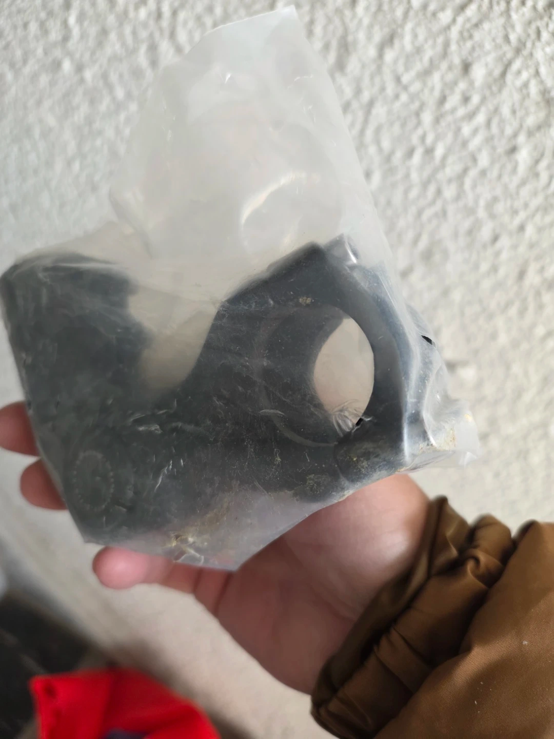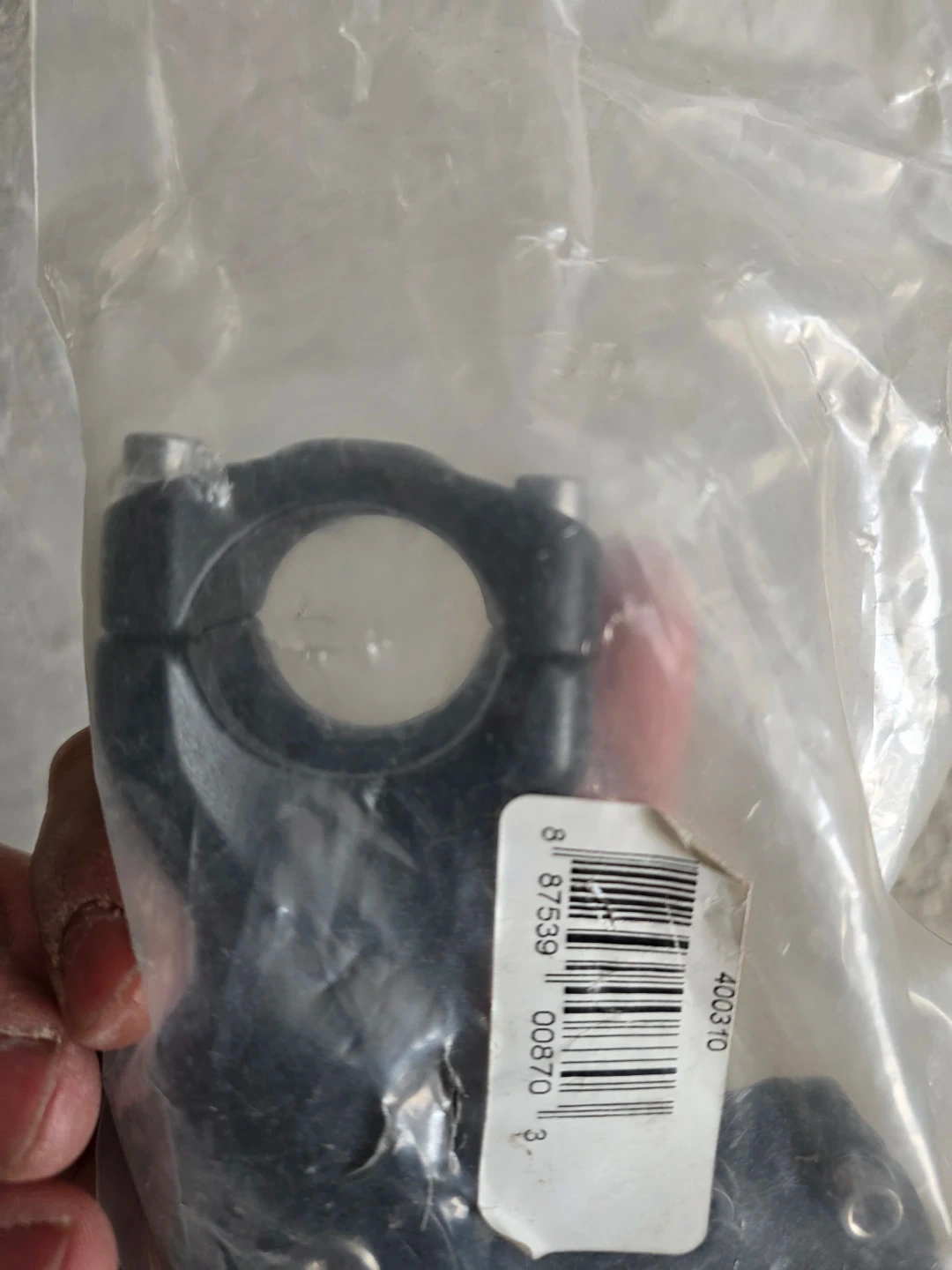This is a black bicycle stem, likely for a mountain bike. It appears to be made of durable metal. It comes in its original plastic packaging. This stem is designed to connect the handlebars to the fork's steerer tube.
