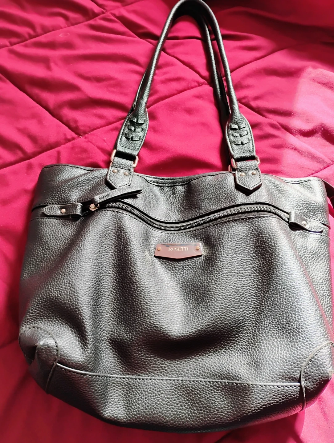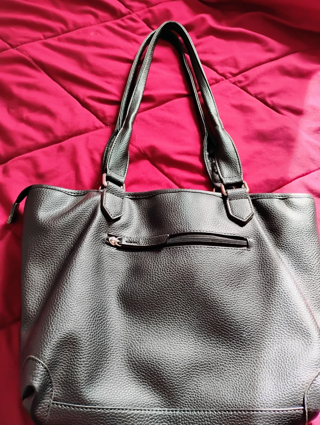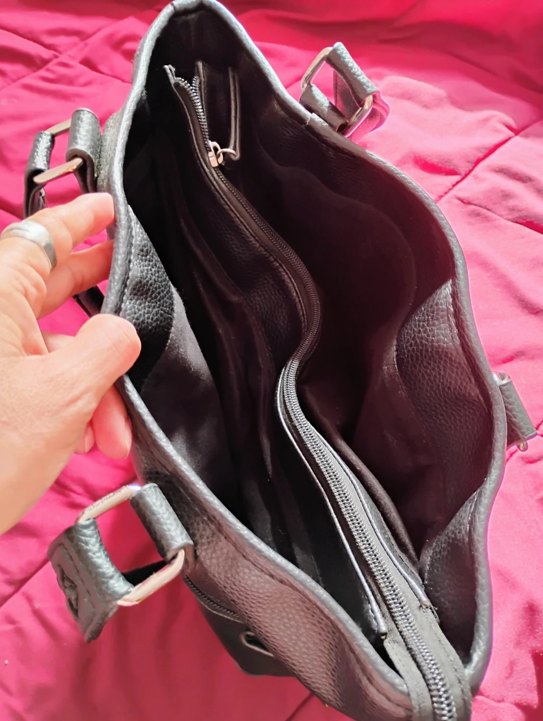 🧡Black faux leather tote bag with a pebbled texture. It features a zip-top closure and a front zip pocket. The interior has multiple compartments for organization.