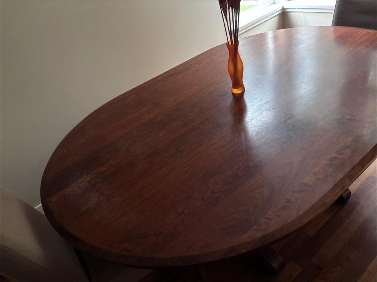 Selling a lovely wooden dining table! It's in good condition and would be perfect for a family or anyone who enjoys hosting dinner parties. The rich, dark wood adds a touch of warmth and elegance to any dining space.