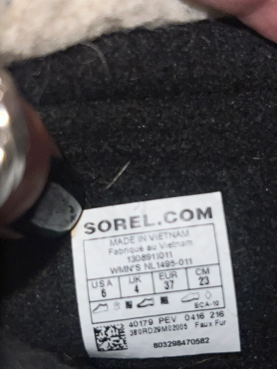 These Sorel boots are waterproof and made for winter weather. They feature faux fur lining for warmth. Made in Vietnam. Size 6 USA, 4 UK, 37 EUR, 23 CM.