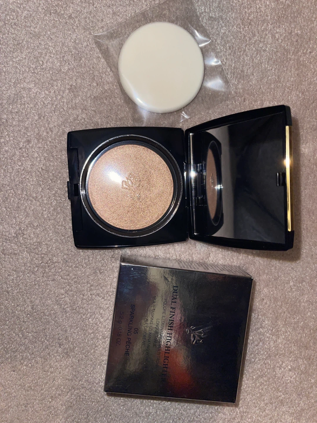 Selling a Lancome Dual Finish Highlighter in the shade Sparkling Peche (05). It's a multi-tasking illuminating powder that's great for all-day wear. Comes with the original box and applicator sponge! The box indicates it contains 5.2 g / 0.18 oz of product