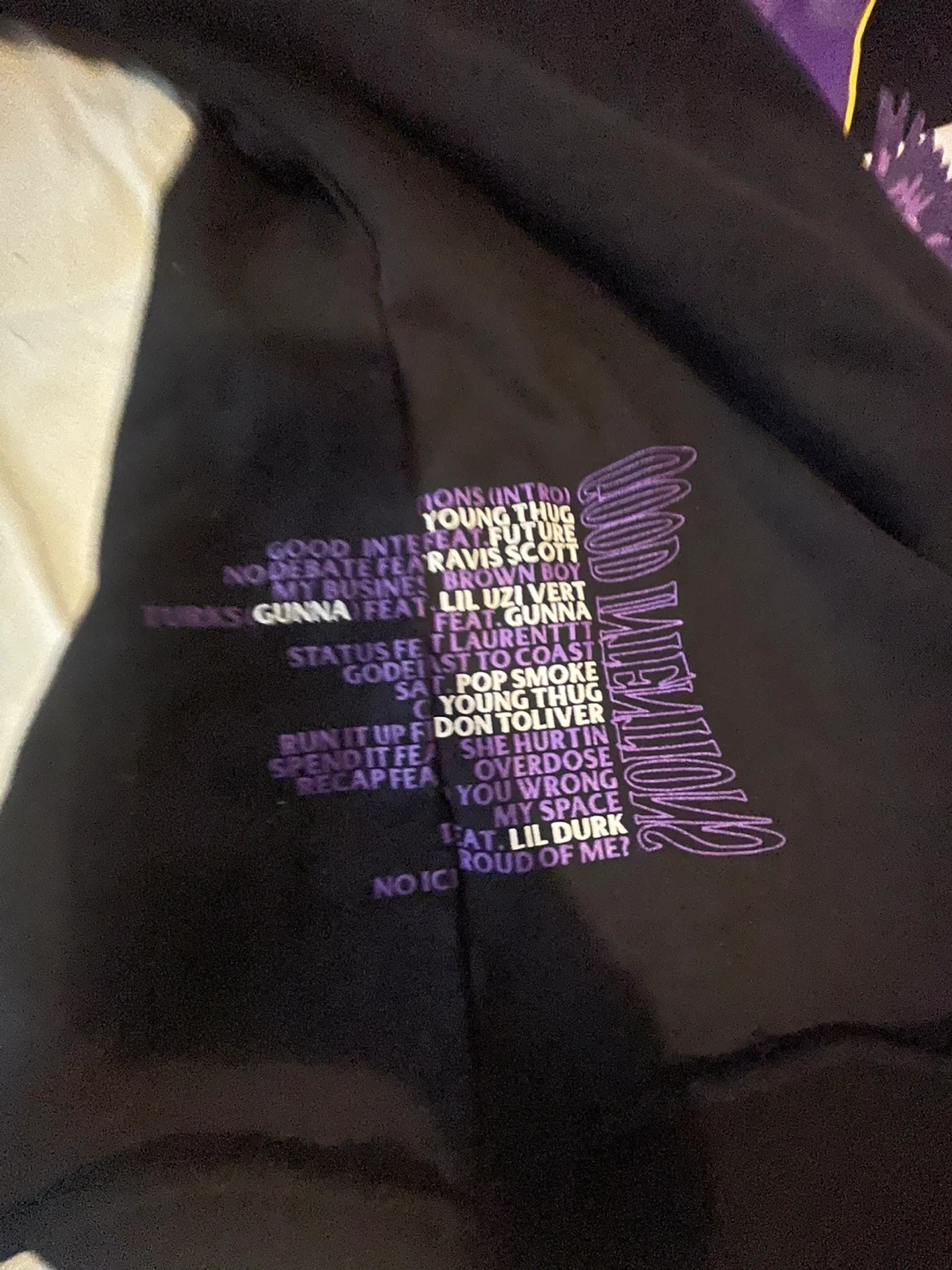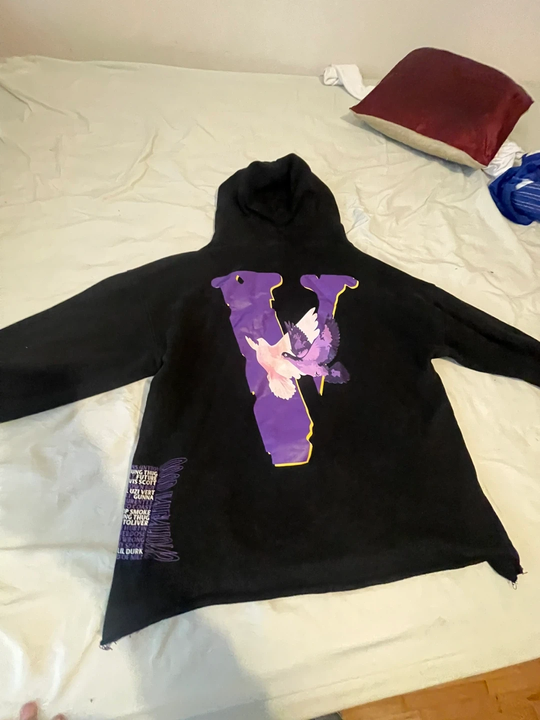 Black Vlone hoodie with "Good Intentions" text on the front. The back features a large purple V with birds. It's made of a soft material. This hoodie is great for casual wear.