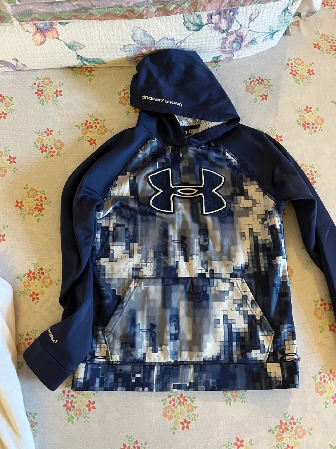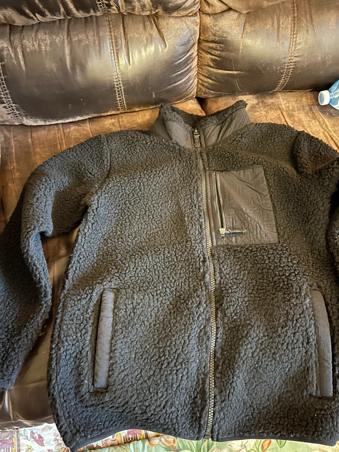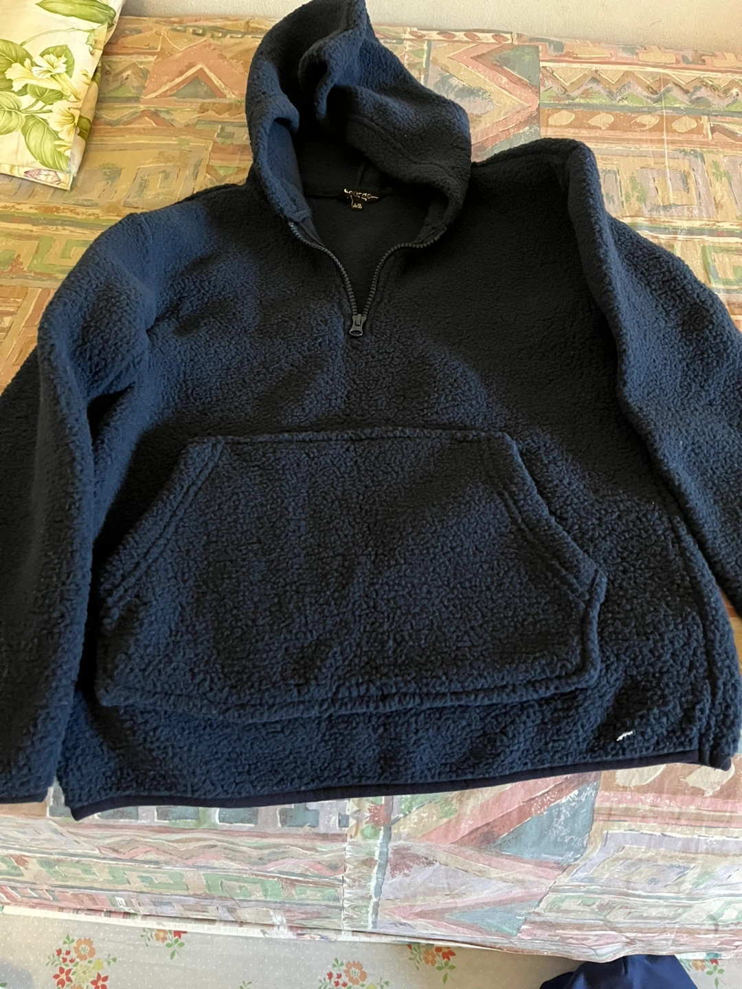 George brand black hoodie made of soft fleece material. It has a kangaroo pocket and a quarter zip closure. Size L (10-12).