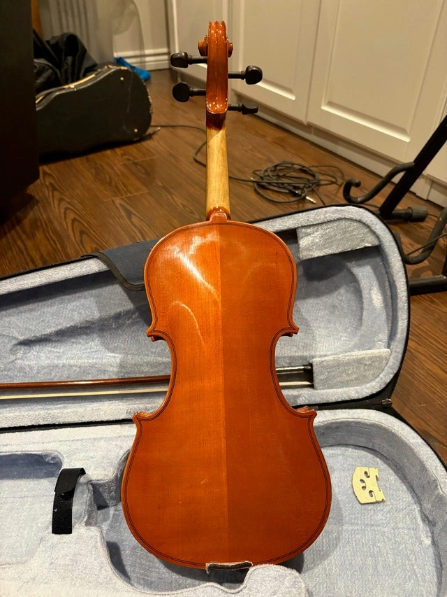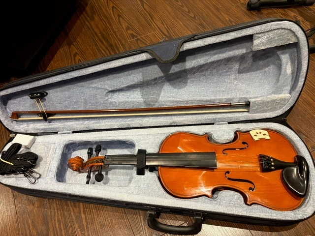 Brand new full size (4/4) acoustic-electric violin, never played. Perfect for beginners or students. Includes everything you need: high gloss wooden violin with built-in pickup (connect to amp or headphones), quality bow, rosin, adjustable shoulder rest, carrying strap, and sturdy hard case. Purchased but never used. No scratches or issues. Pickup only. E-transfer preferred. Cash accepted.
