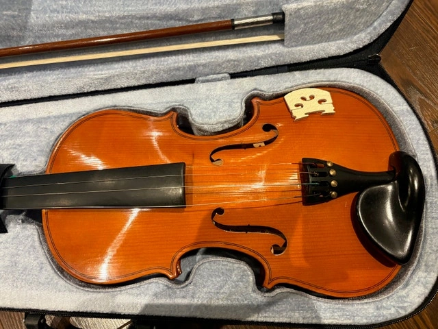Brand new full size (4/4) acoustic-electric violin, never played. Perfect for beginners or students. Includes everything you need: high gloss wooden violin with built-in pickup (connect to amp or headphones), quality bow, rosin, adjustable shoulder rest, carrying strap, and sturdy hard case. Purchased but never used. No scratches or issues. Pickup only. E-transfer preferred. Cash accepted.