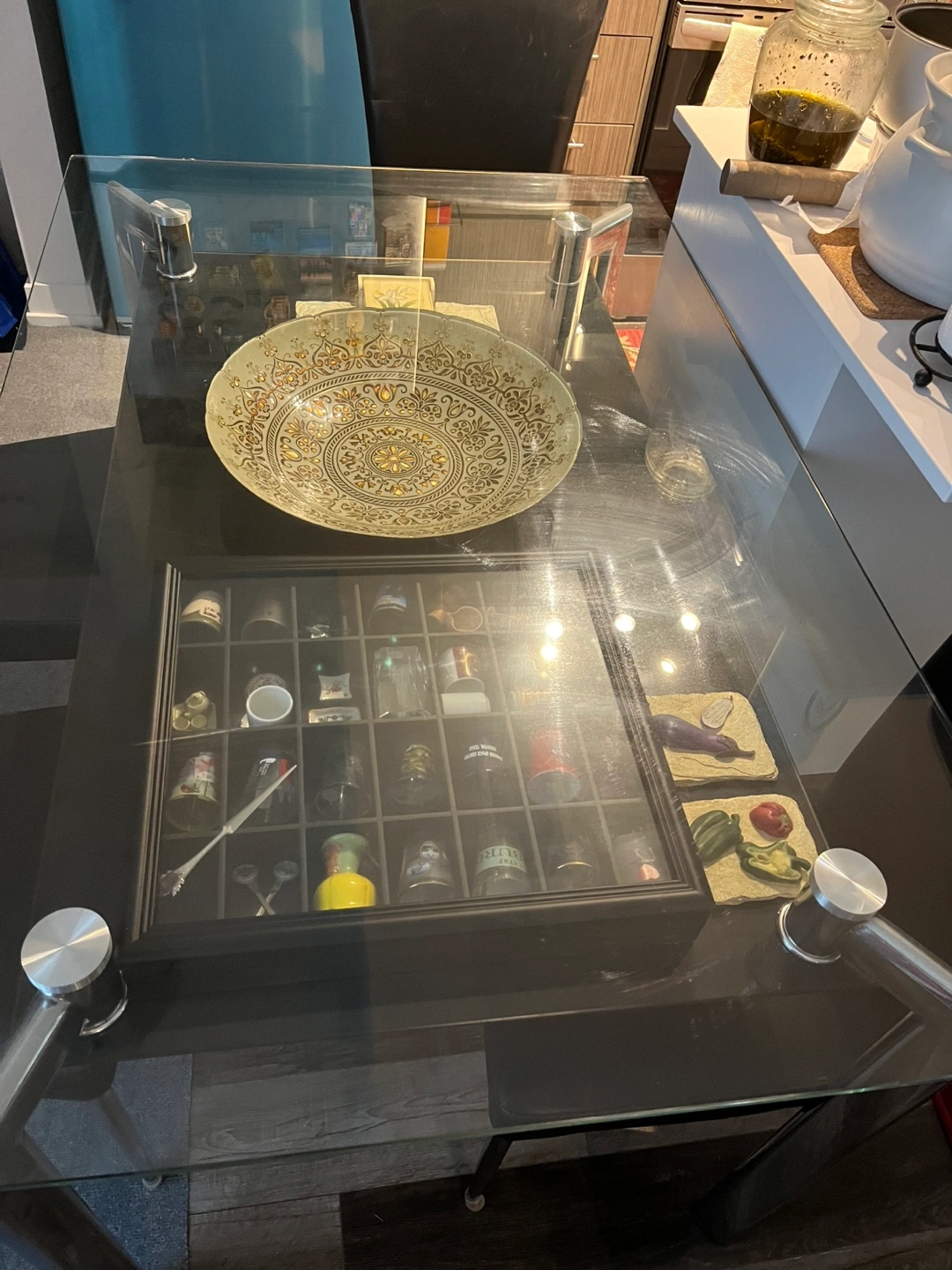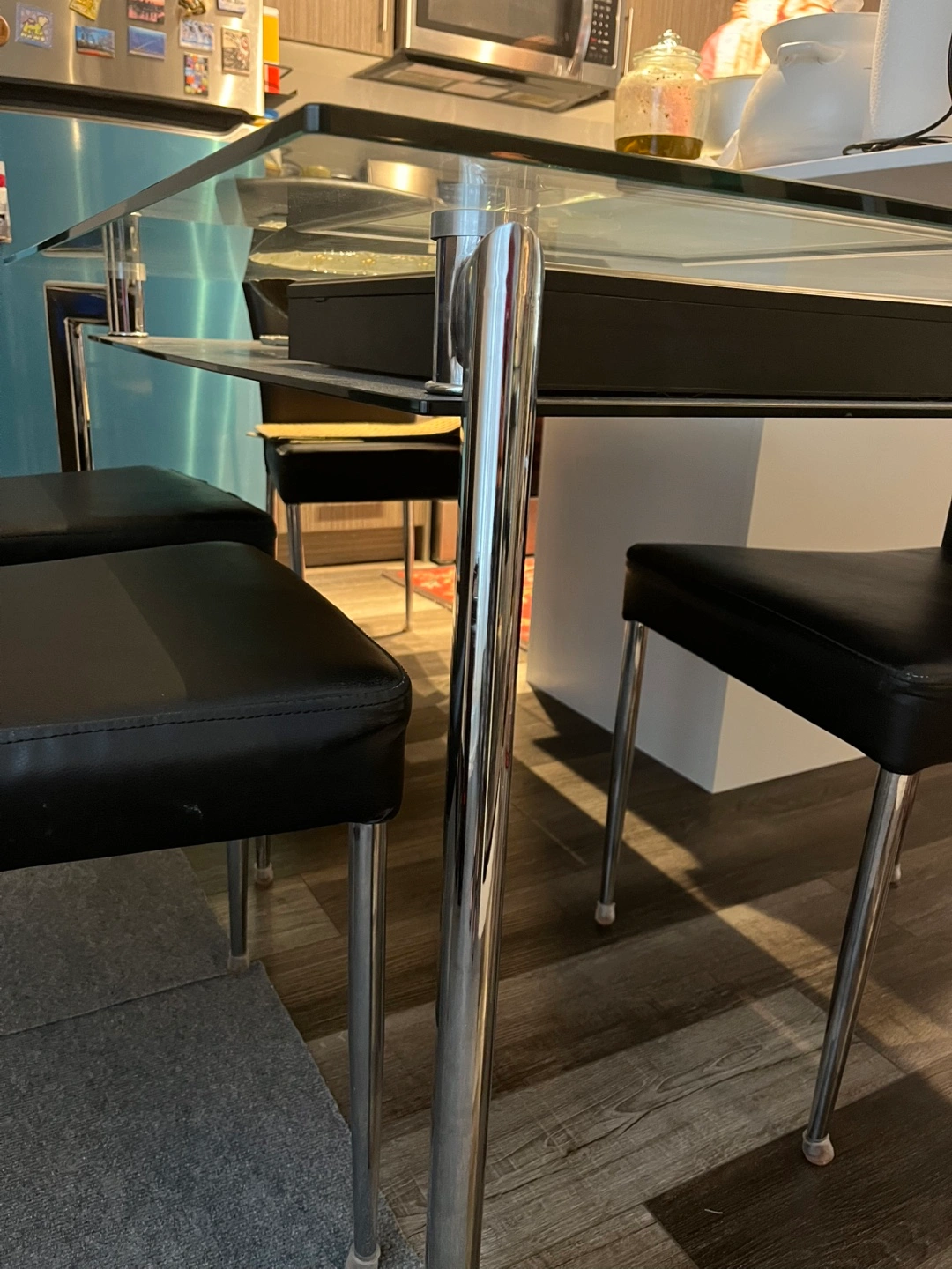 Modern full size dining table from the Bricks. It has two shelves, bottom shelf is tinted black as a classic addition as display or tuck away. Glass table top has chrome legs, no chips, Minimalist style.