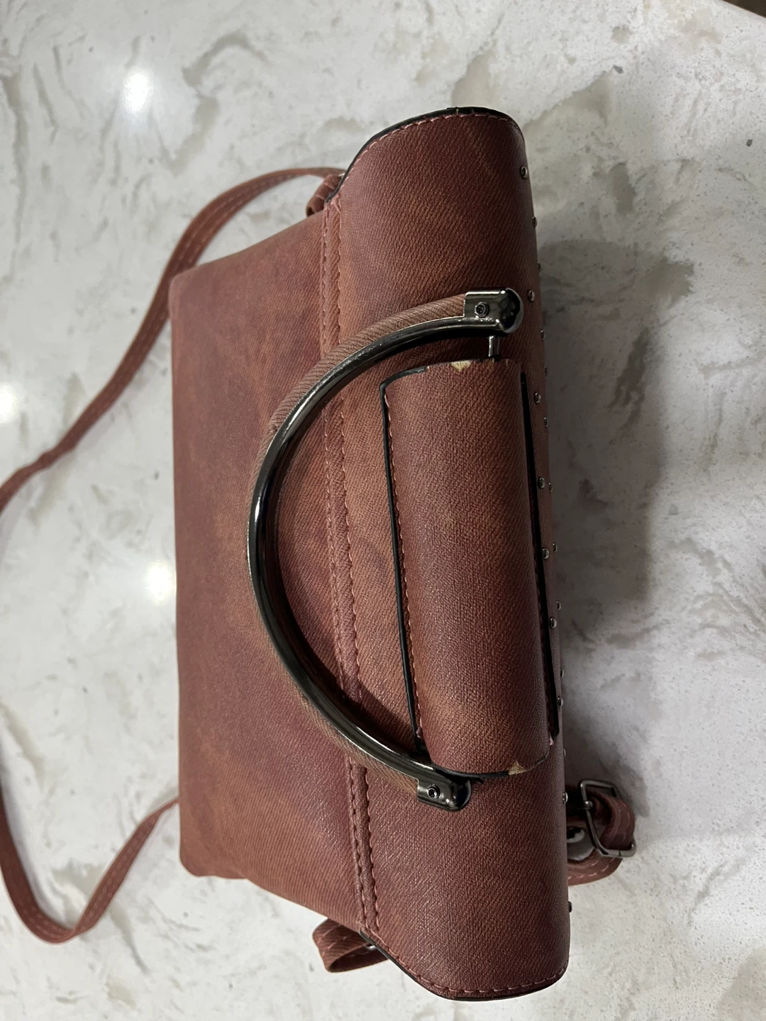 Selling a brown crossbody bag. It's in good condition and has a unique design with a metal handle and studded details. Perfect for carrying your essentials while keeping your hands free!