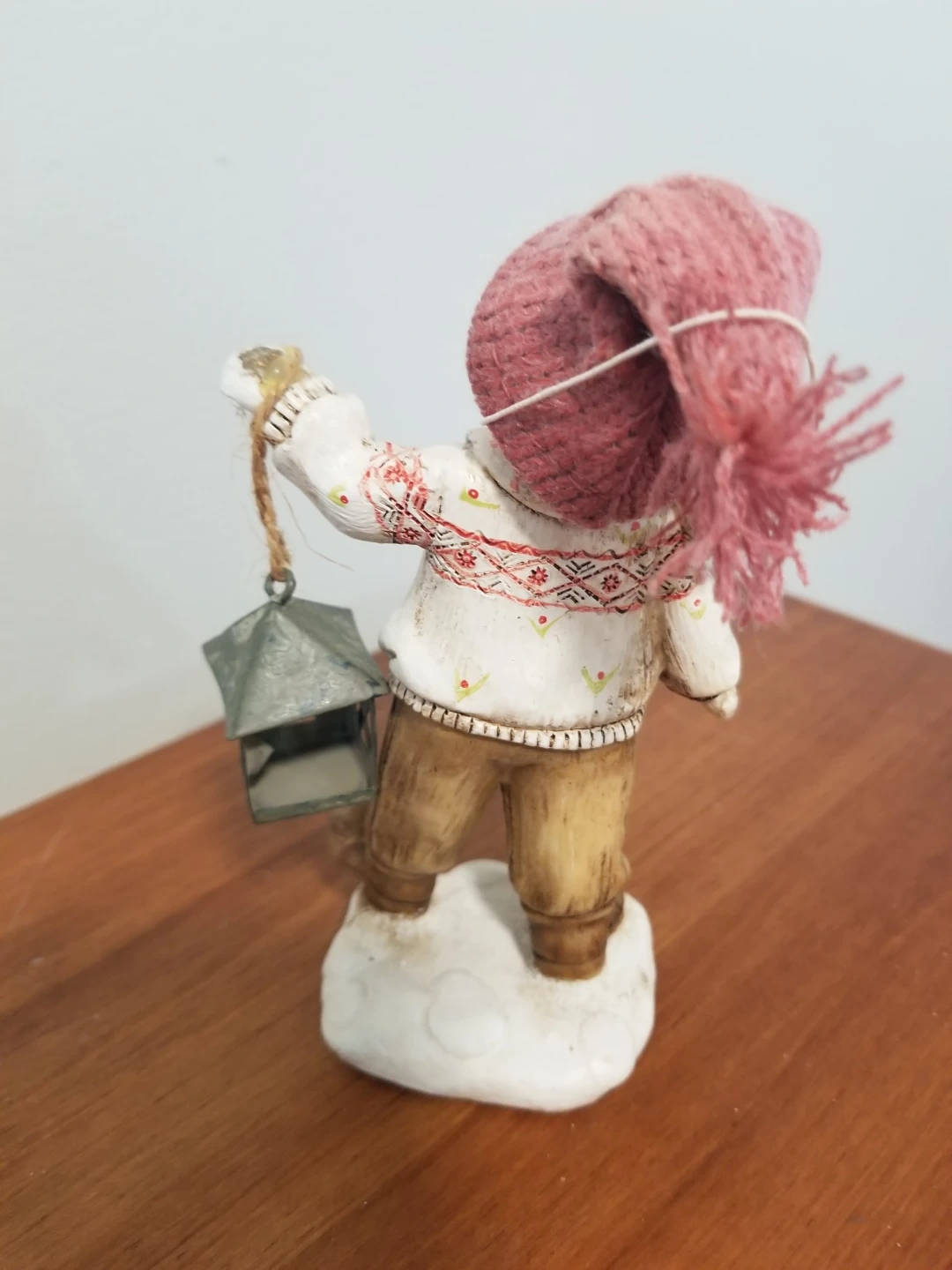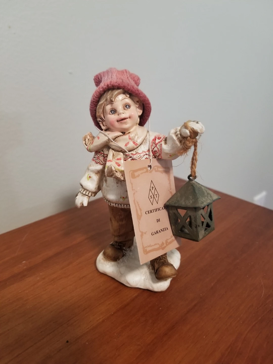This charming collectible figurine depicts a young boy dressed in winter attire, holding a lantern. It appears to be made from a resin or ceramic material. A 'Certificato di Garanzia' tag is attached. It's a lovely decorative piece for any shelf or mantel. 5 inch