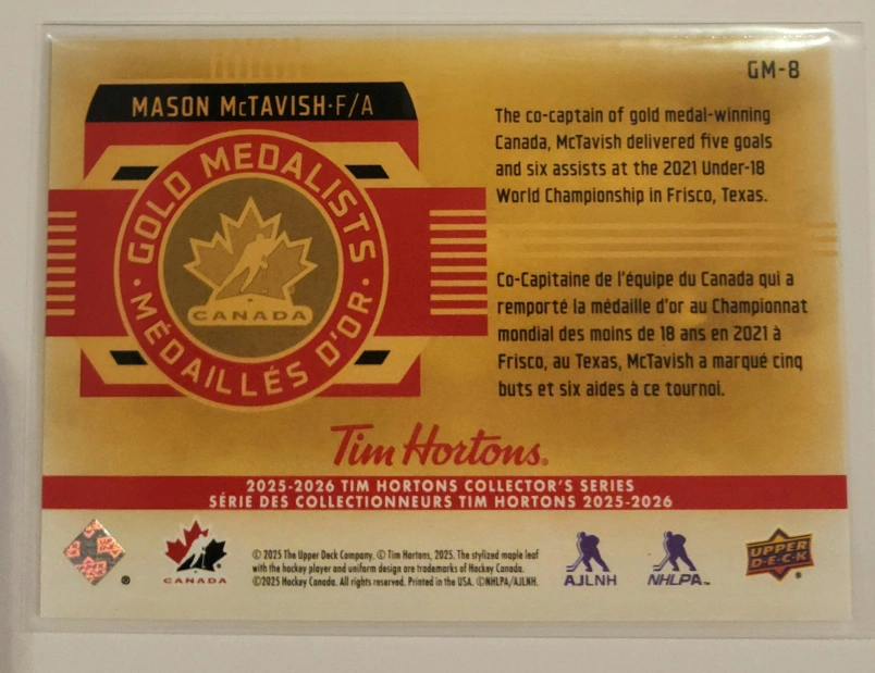 Mason McTavish "Gold Medalists" insert - Tim Hortons collector's series hockey cards Team Canada 2026 Olympics. Mint.