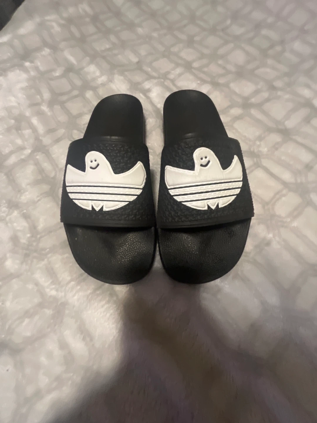 Selling a pair of Adidas Adilette slides in black. They feature the classic Adidas three-stripe design with a fun, smiley face twist. Great for casual wear!