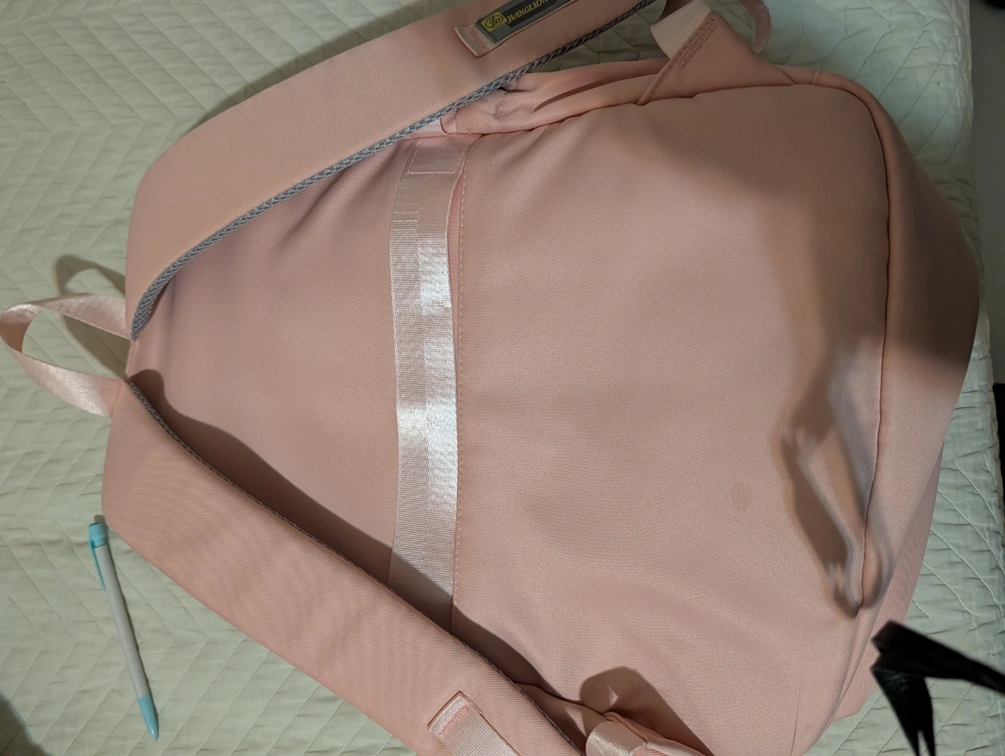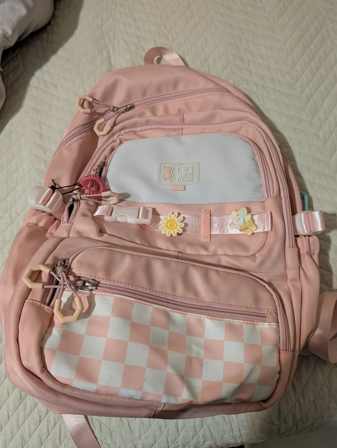 This pink backpack has a checkerboard pocket on the front and comes with cute charms. It features multiple zippered compartments for organization. The interior is lined with a star pattern.