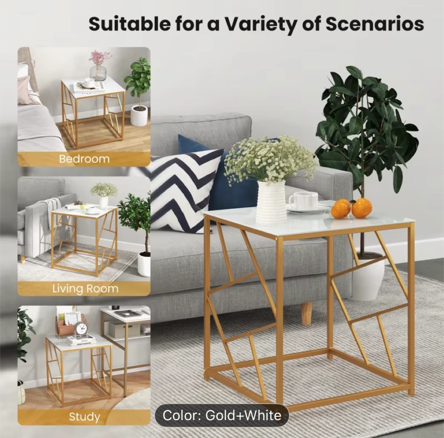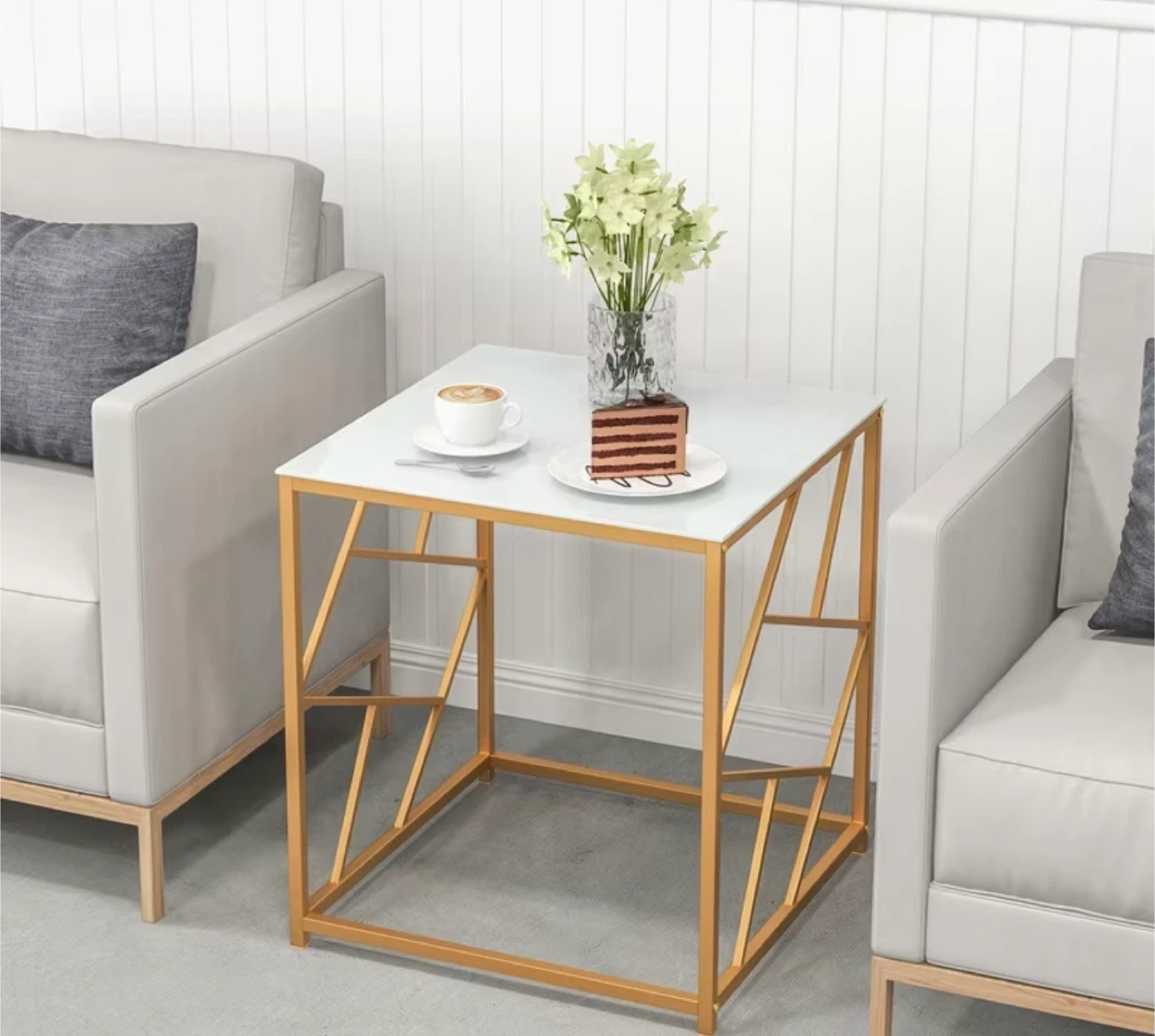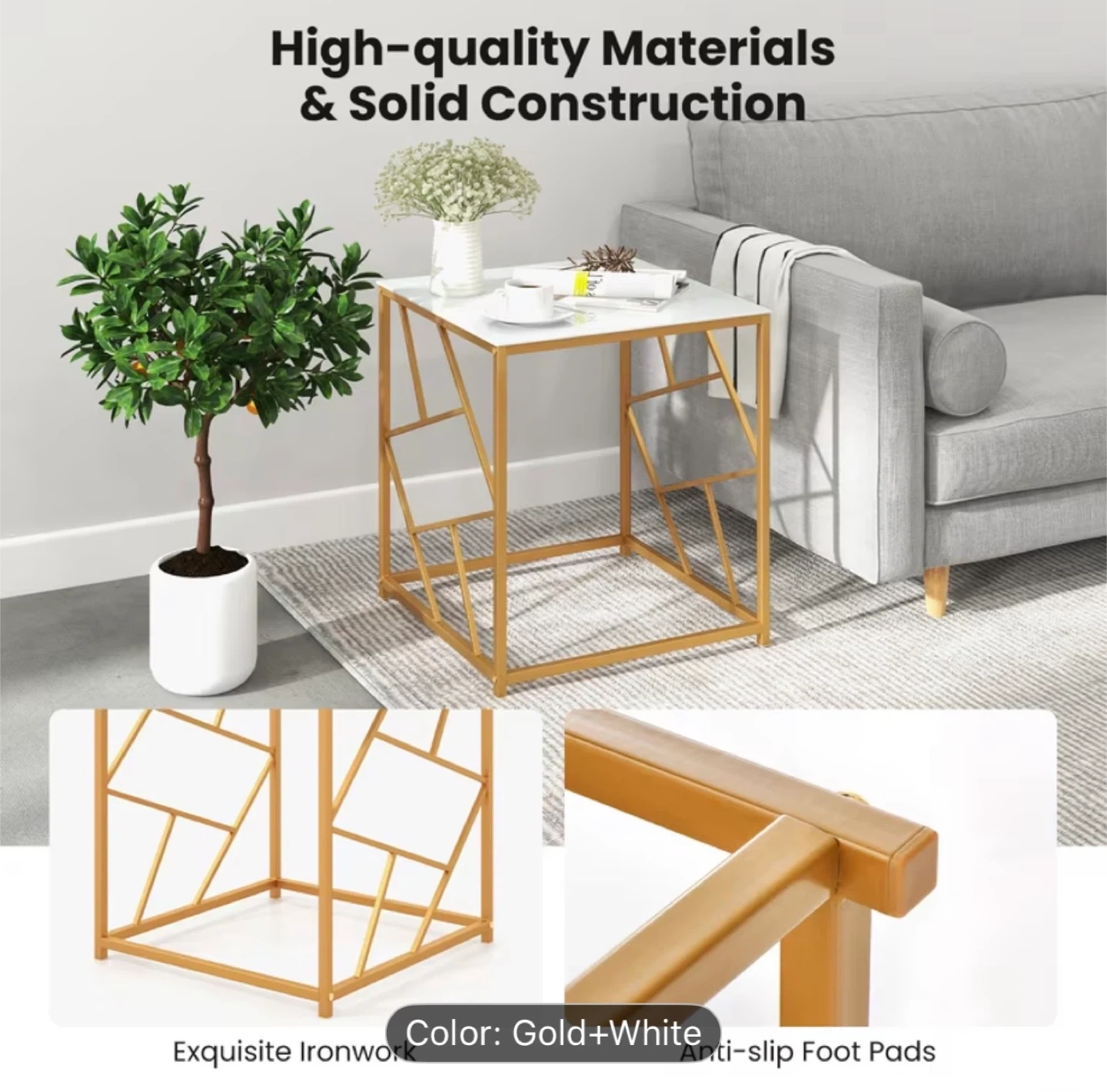 It features a beautiful gold frame with a white top, and its geometric design adds a unique flair. The dimensions are 19.5" x 19.5", with a height of 21.5".