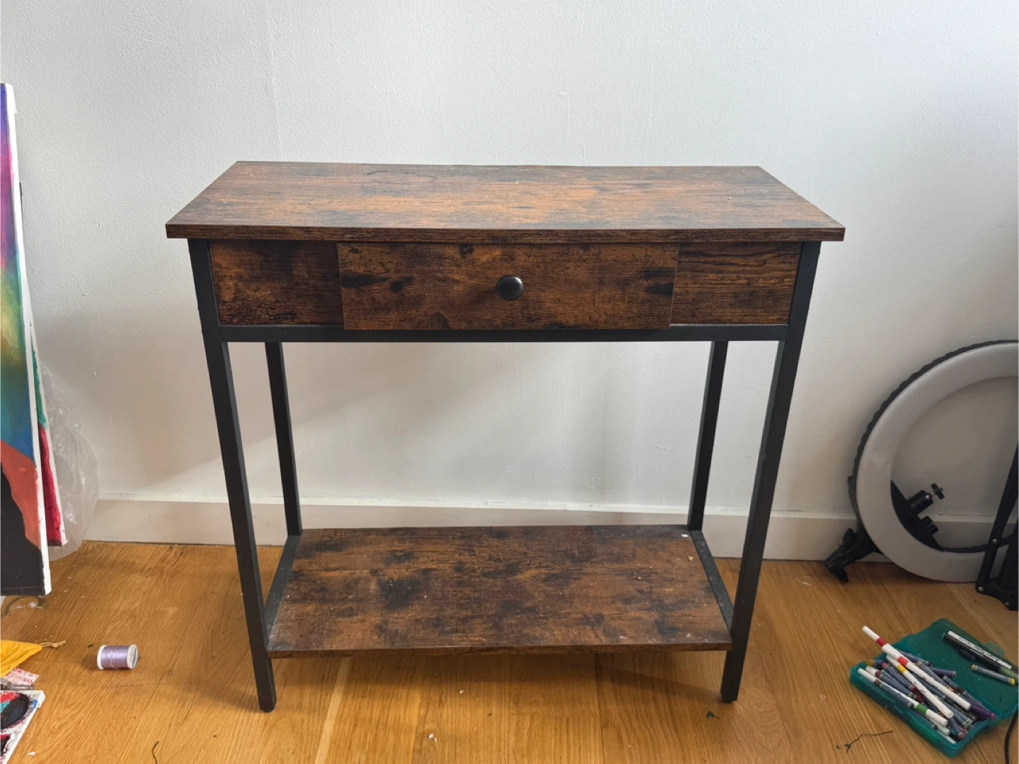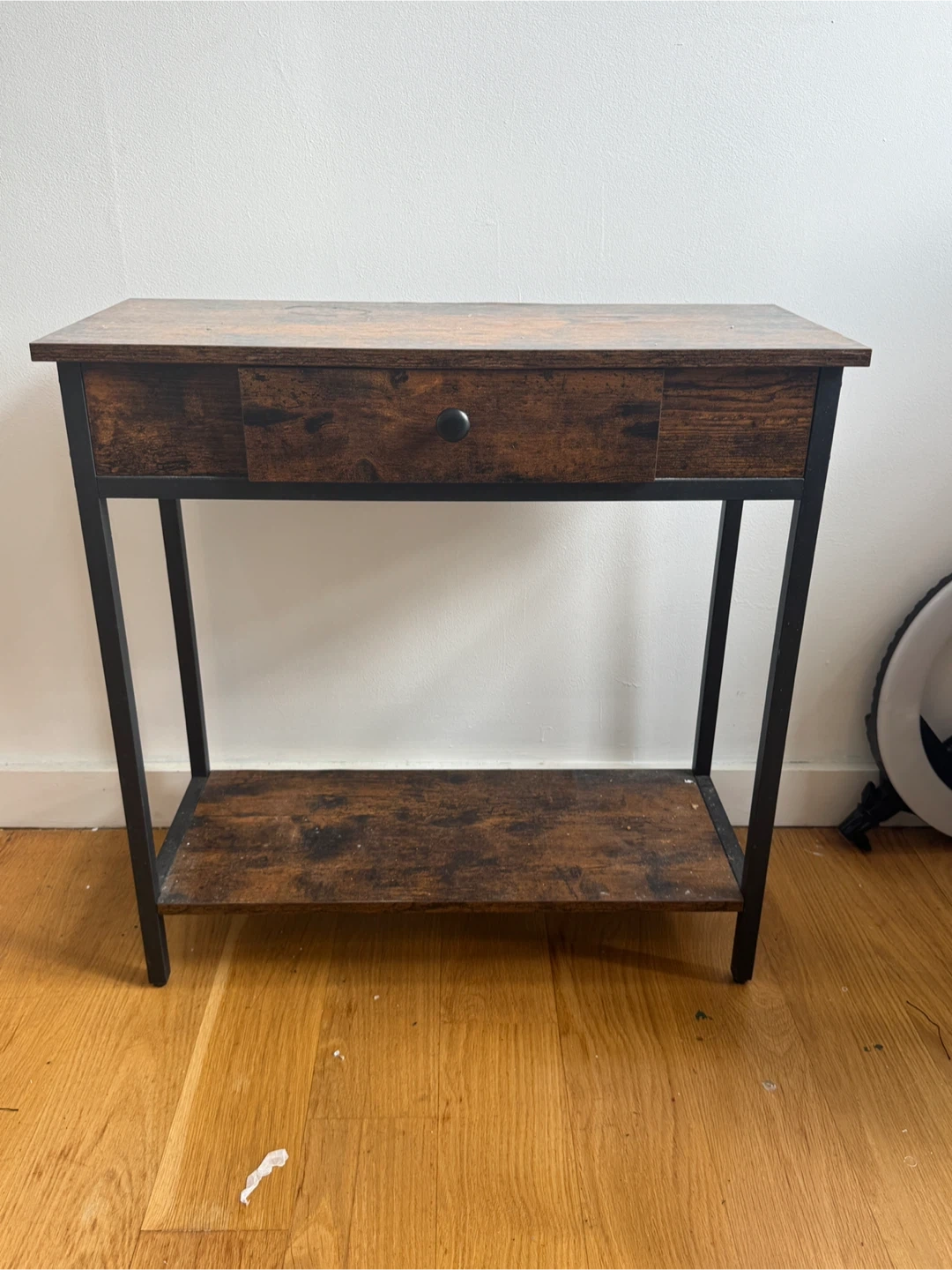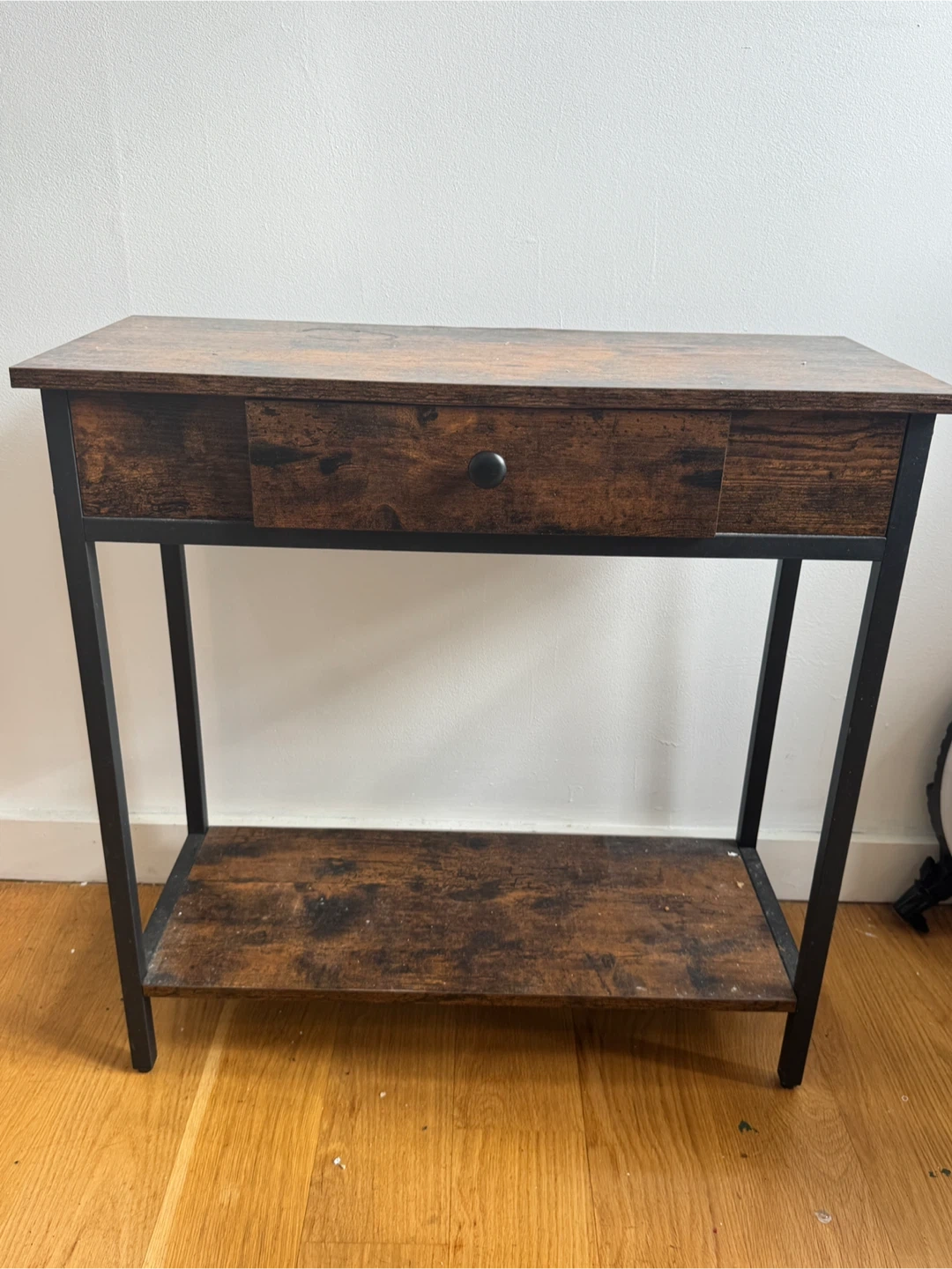 Selling a console table with a drawer and a bottom shelf. It's a great piece for an entryway or small space. The table is made of wood with a dark brown finish and has a simple, modern design. It's in good condition and ready for a new home!