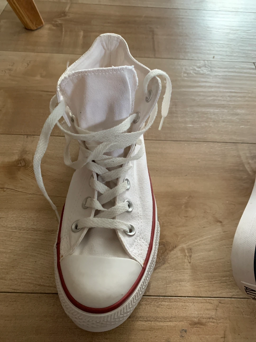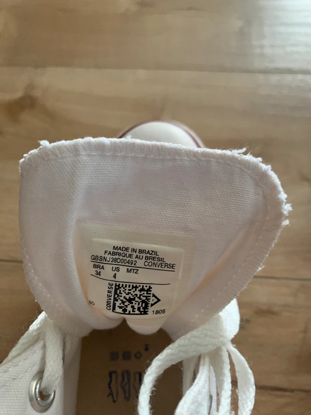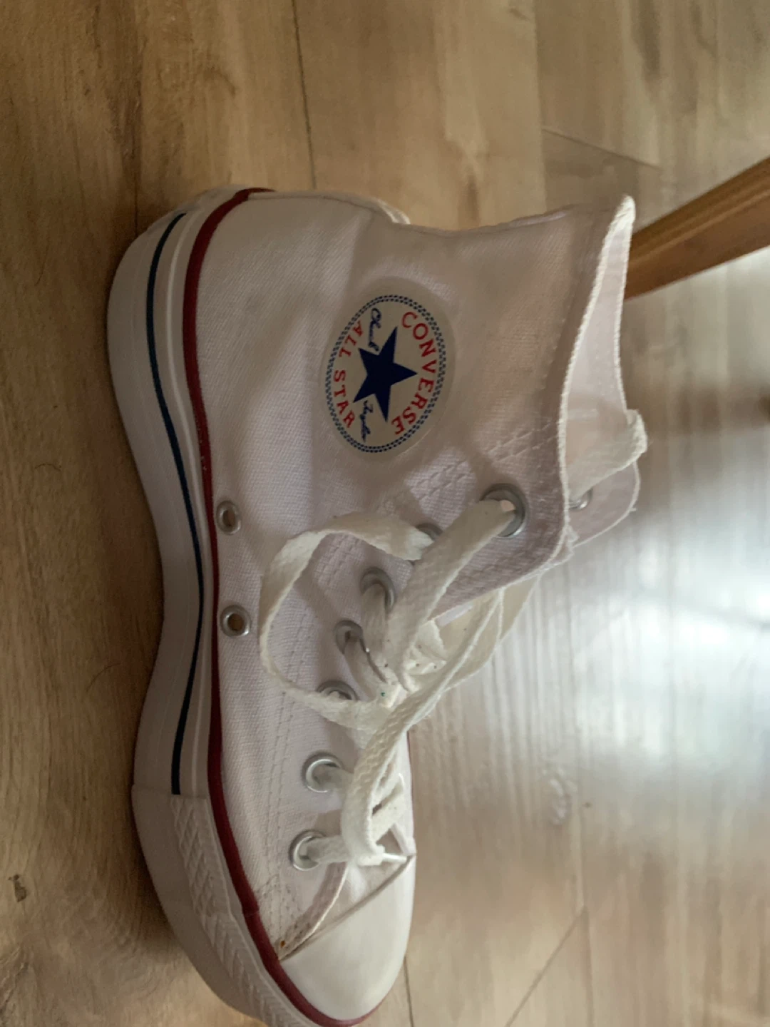 Classic white Converse high-top sneakers. Canvas upper with rubber toe cap and sole. Features the iconic All Star logo patch. A timeless footwear choice for casual wear.