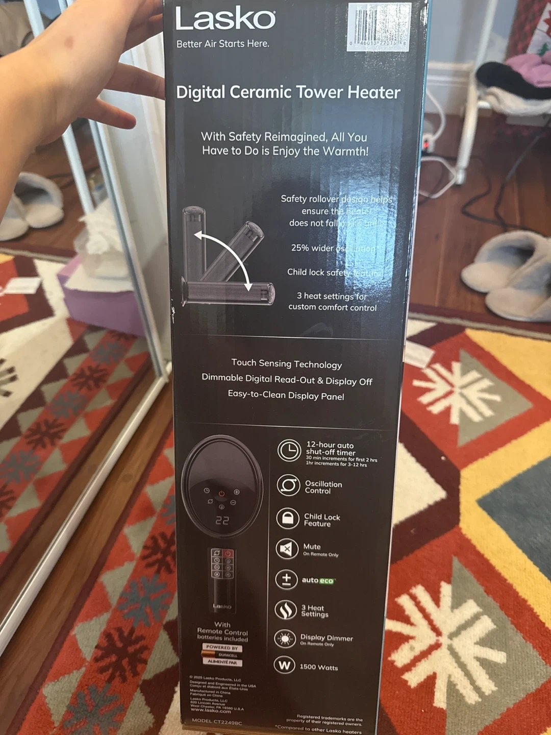 Lasko Digital Ceramic Tower Heater. It features touch sensing technology, a dimmable display, and oscillation control. Includes 3 heat settings and 12-hour auto shut-off timer. This heater is 1500 Watts.
