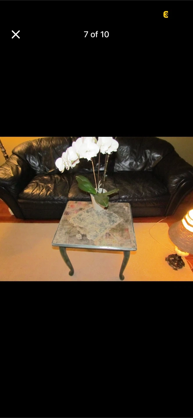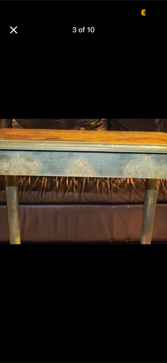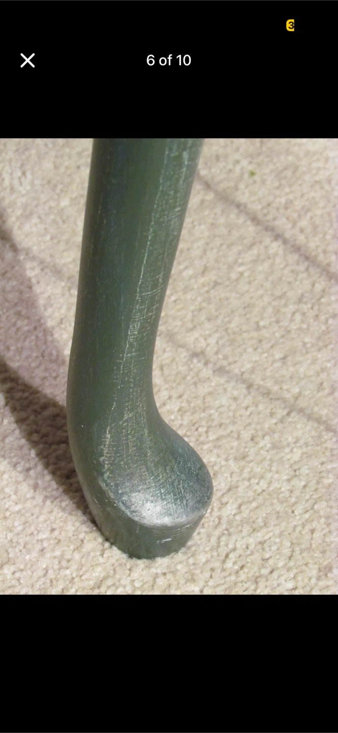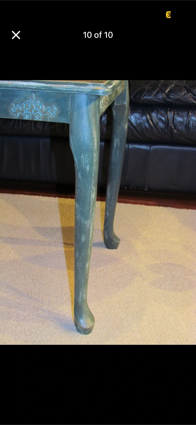 This is a quaint accent table with a distressed green finish. It features delicate floral carvings on the apron and cabriole legs. The tabletop has a detailed scenic print.