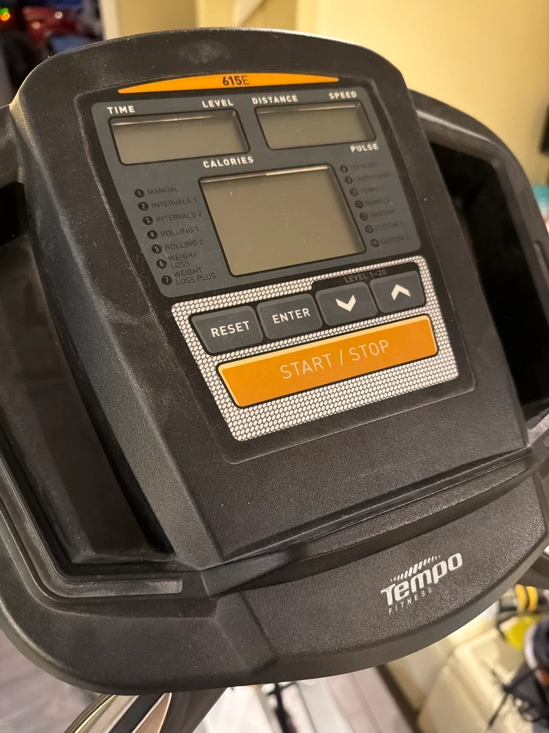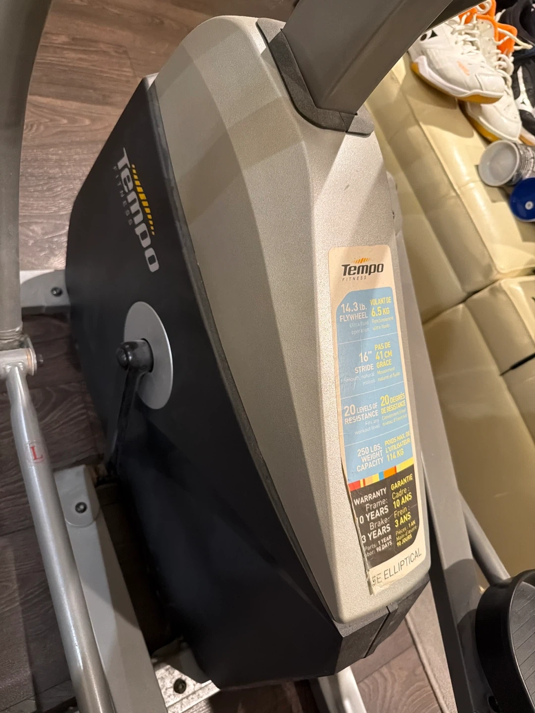 Tempo Fitness 615E elliptical with a 14.3 lb flywheel. It offers 20 levels of resistance and a 16" stride length. Max user weight capacity is 250 lbs.
