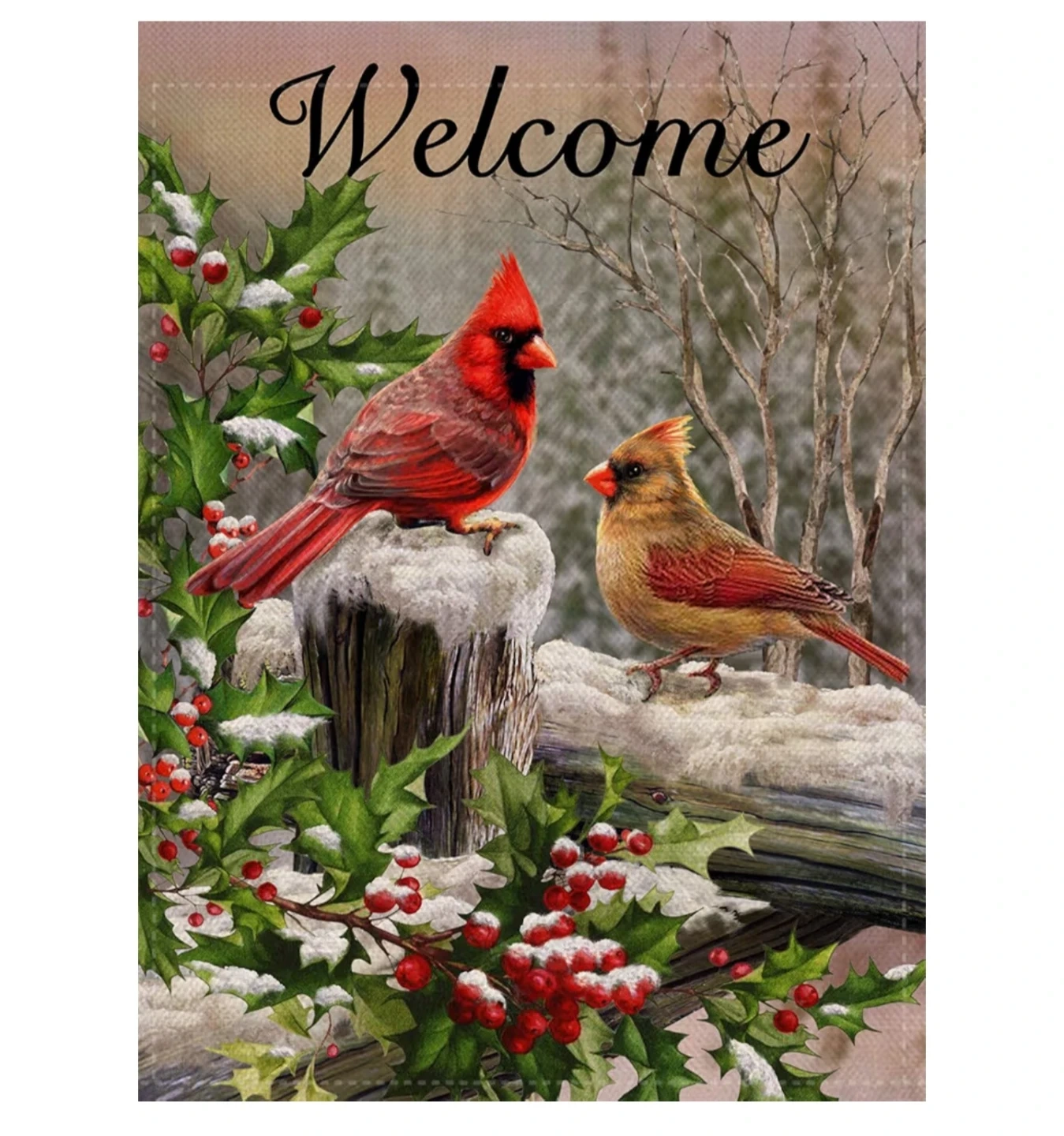 This fade-resistant garden flag features a winter scene with two cardinals, holly, and berries. The "Welcome" text is printed on both sides. It's perfect for adding a festive touch to your yard during the colder months.