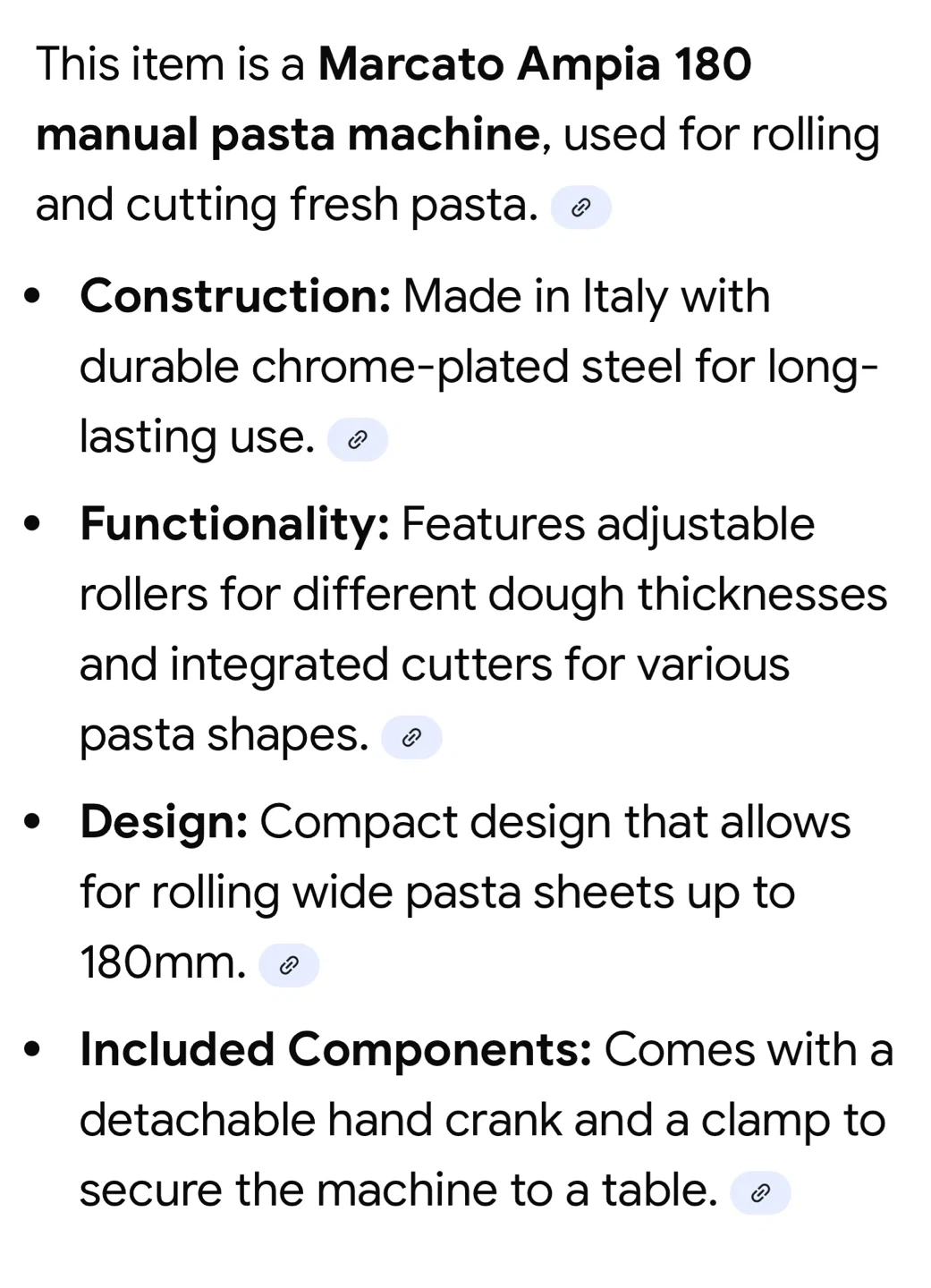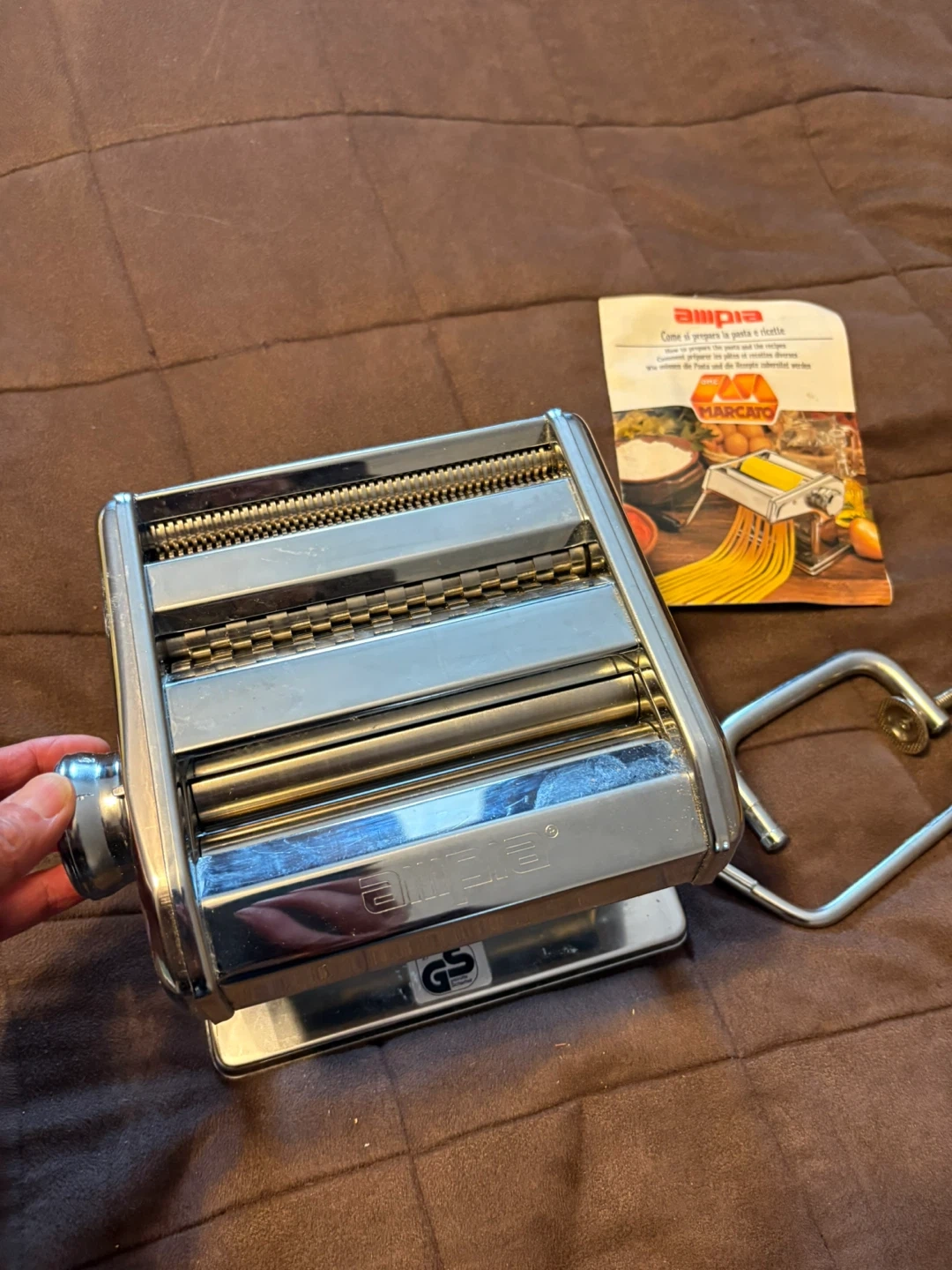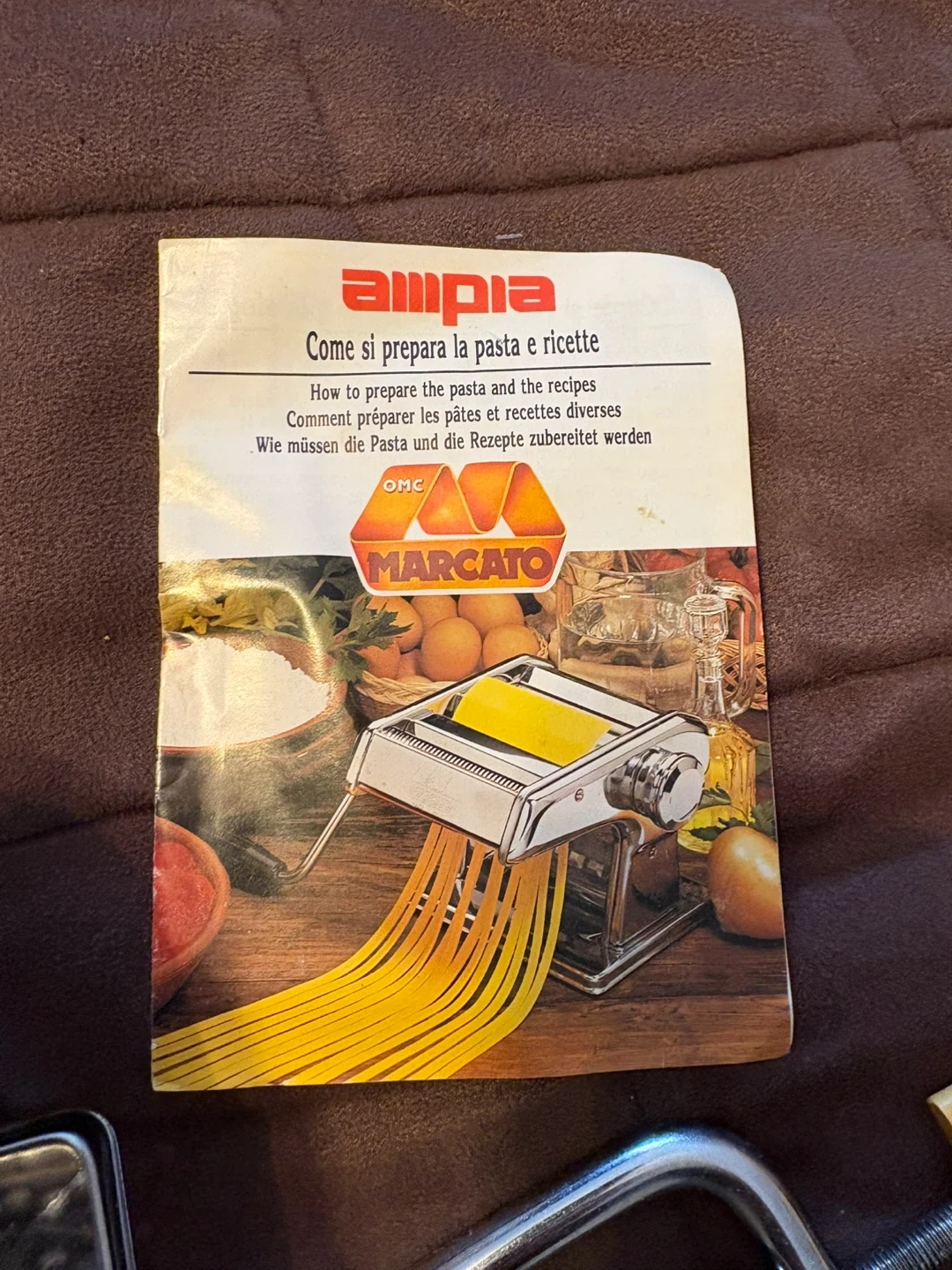 This is a Marcato Ampia 180 manual pasta machine, made in Italy. It's constructed with durable chrome-plated steel and features adjustable rollers for different dough thicknesses. Includes a detachable hand crank and clamp. Includes instruction booklet.