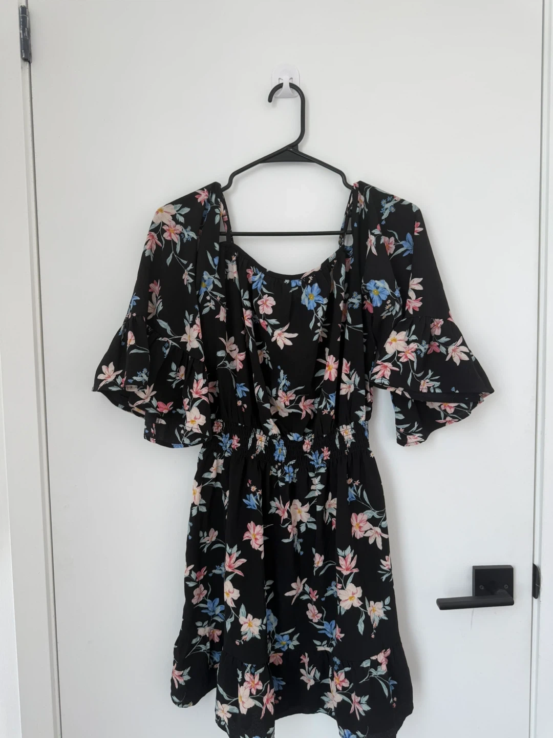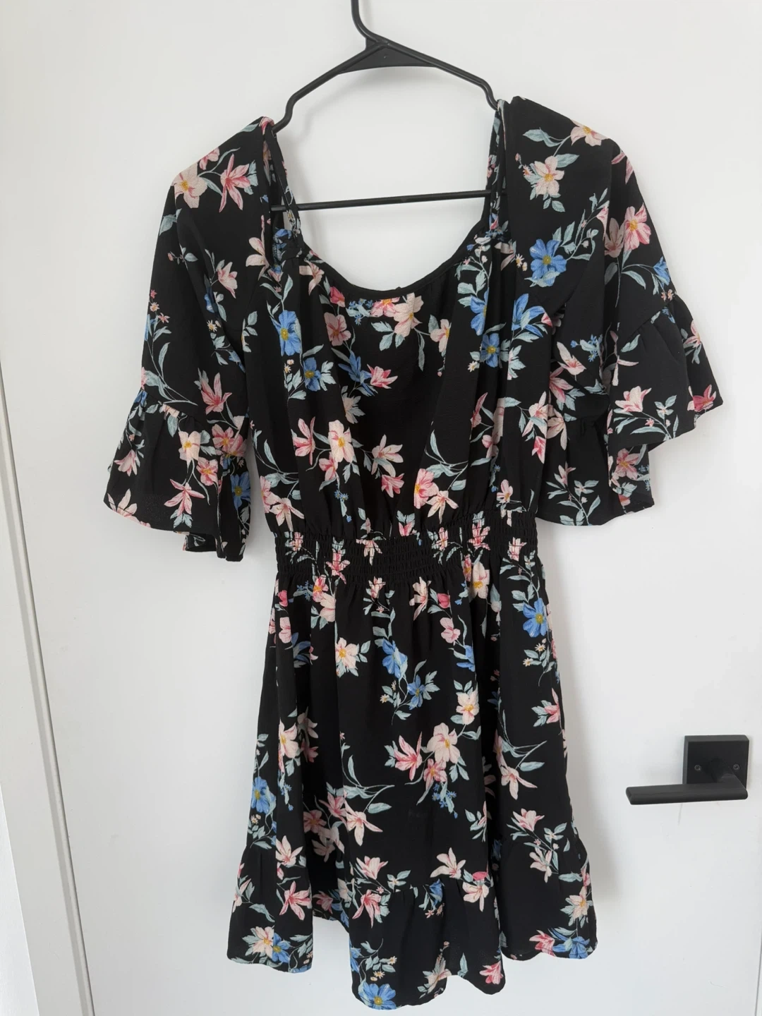 Chic black dress with a vibrant floral print. Features an off-the-shoulder neckline and ruffled sleeves. Perfect for a summer outing or casual wear! (Never worn)