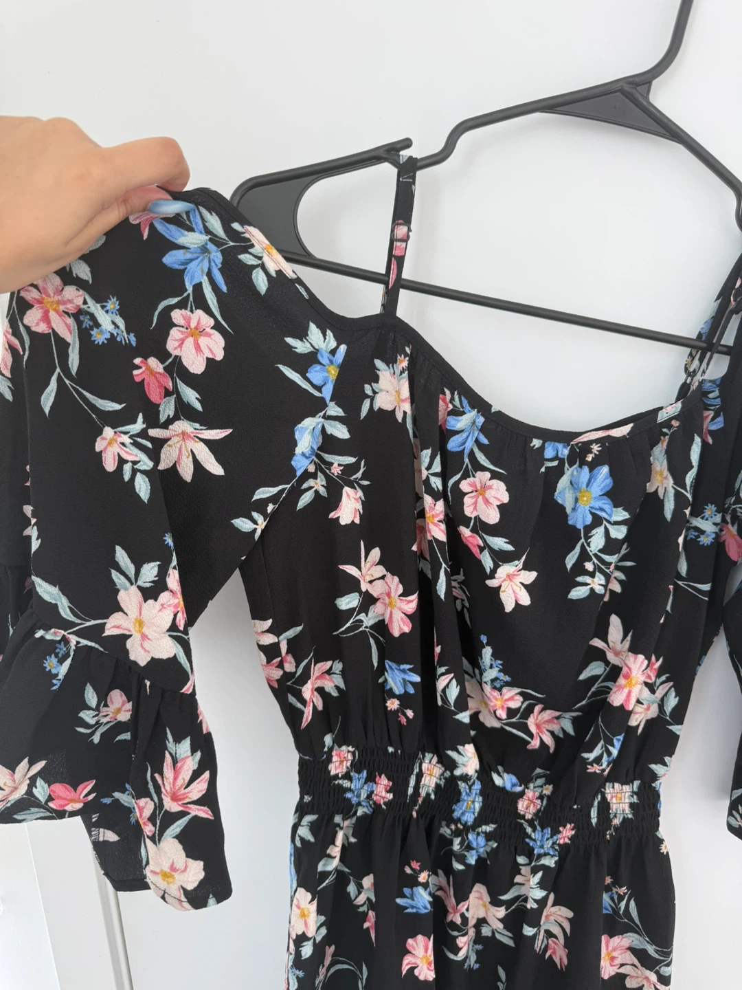 Chic black dress with a vibrant floral print. Features an off-the-shoulder neckline and ruffled sleeves. Perfect for a summer outing or casual wear! (Never worn)