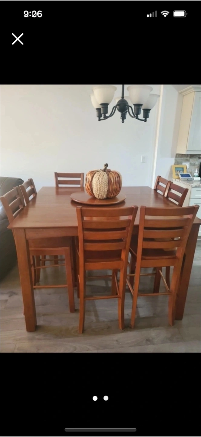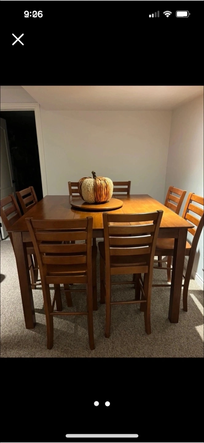 Selling a wooden counter height dining table that comes with 8 matching chairs. The set is in very good condition and perfect for a family dining room or kitchen. It's a sturdy and reliable set that will last for years to come! Has a leaf and lazy Susan.