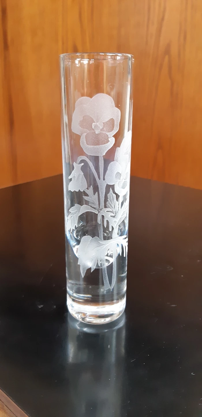 It features a delicate etched pansy design and is in great condition.... Perfect for adding a touch of elegance to any room!