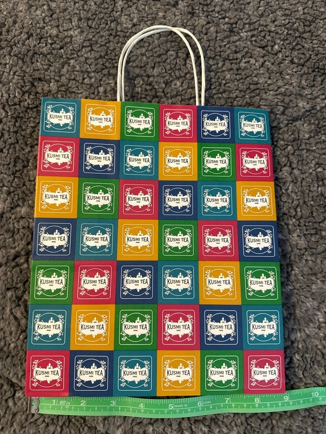 This colourful Kusmi Tea boutique paper gift bag is perfect for any tea lover. It's a designer bag that adds a touch of class to any gift. It measures approximately 9 inches by 8 inches by 3 inches. It is in used condition. Brand: Kusmi Tea, Type: Boutique Gift Bag, Material: Paper, Design: Colourful Kusmi Tea Pattern, Approximate Dimensions: 9" x 8" x 3". Similar bags are listed on Kijiji for between $25 and $50. If the ad is still up, the item is available. Cash accepted.