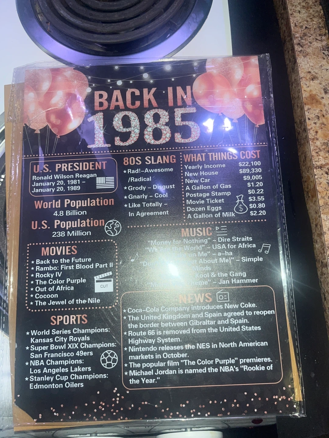 This rose gold 'Back in 1985' and '40 Years' poster set is a fun way to celebrate a milestone birthday. It features facts and trivia from 1985 on one side and a countdown of time in decades on the other. A wooden stand is included for display.