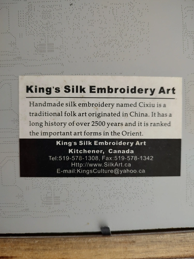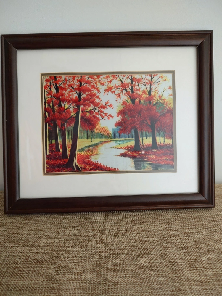 Beautiful framed silk embroidery. Autumnal scene, red trees, river. Brown wooden frame. Made in China. Hand-stitched artwork. one scratch and small chip on bottom of frame