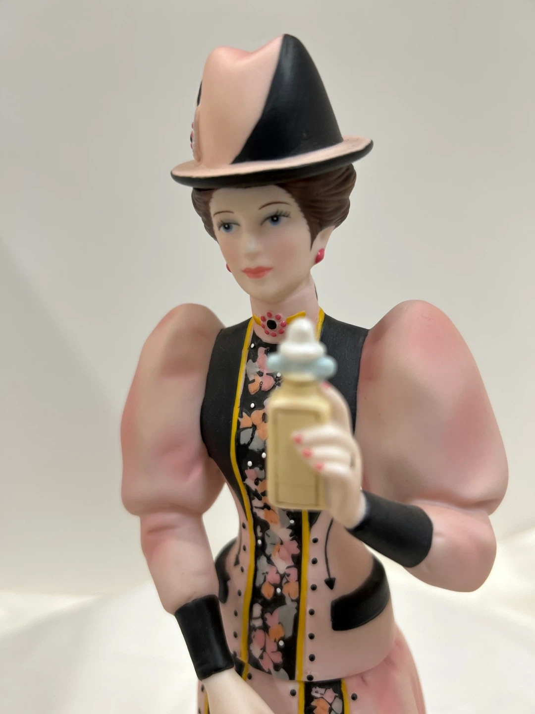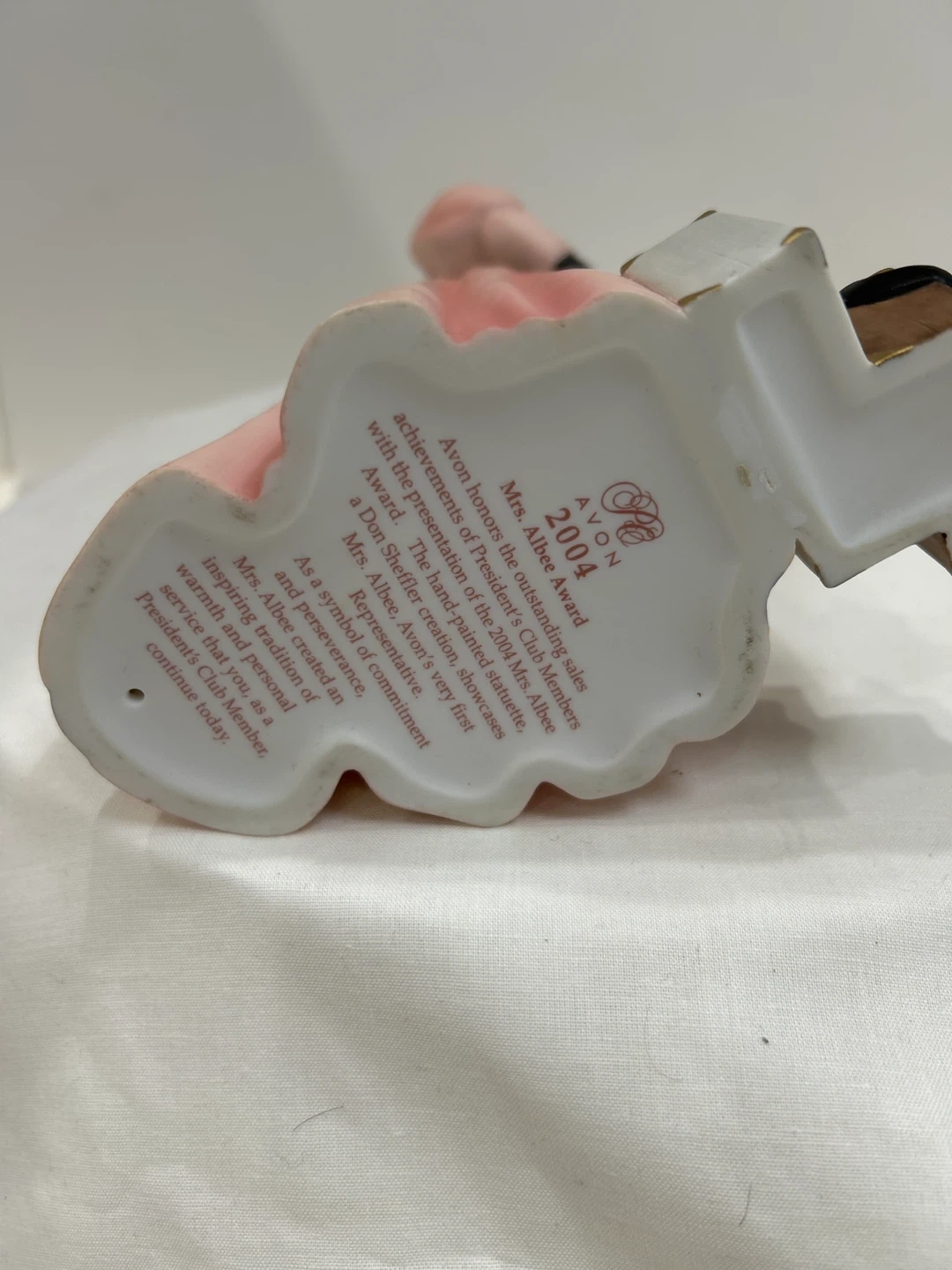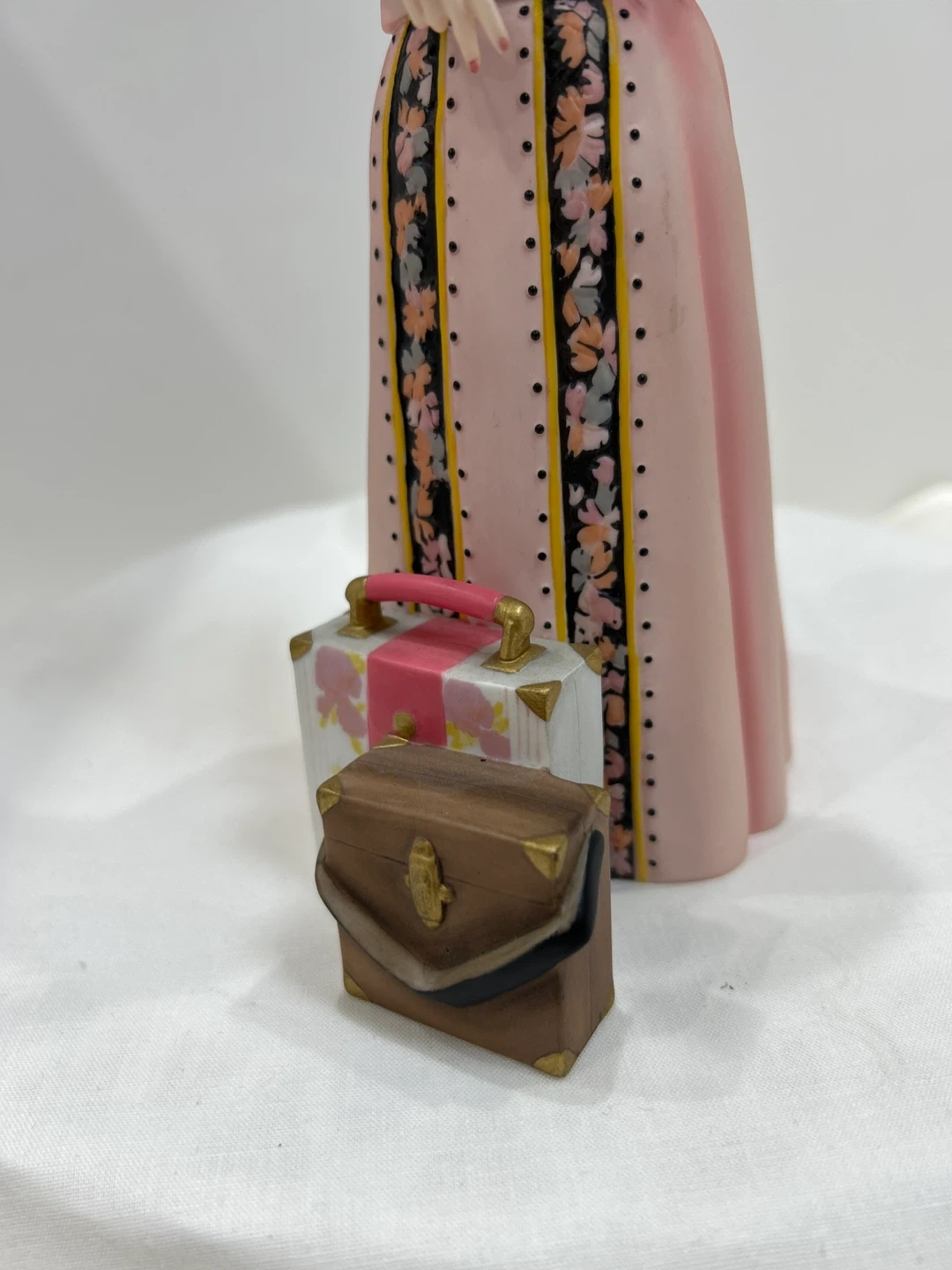 2004 Mrs Albee award porcelain collectible figurine.This charming figurine depicts a lady in a pink Victorian-style dress holding a baby bottle. It includes two miniature suitcases. A lovely decorative piece! π