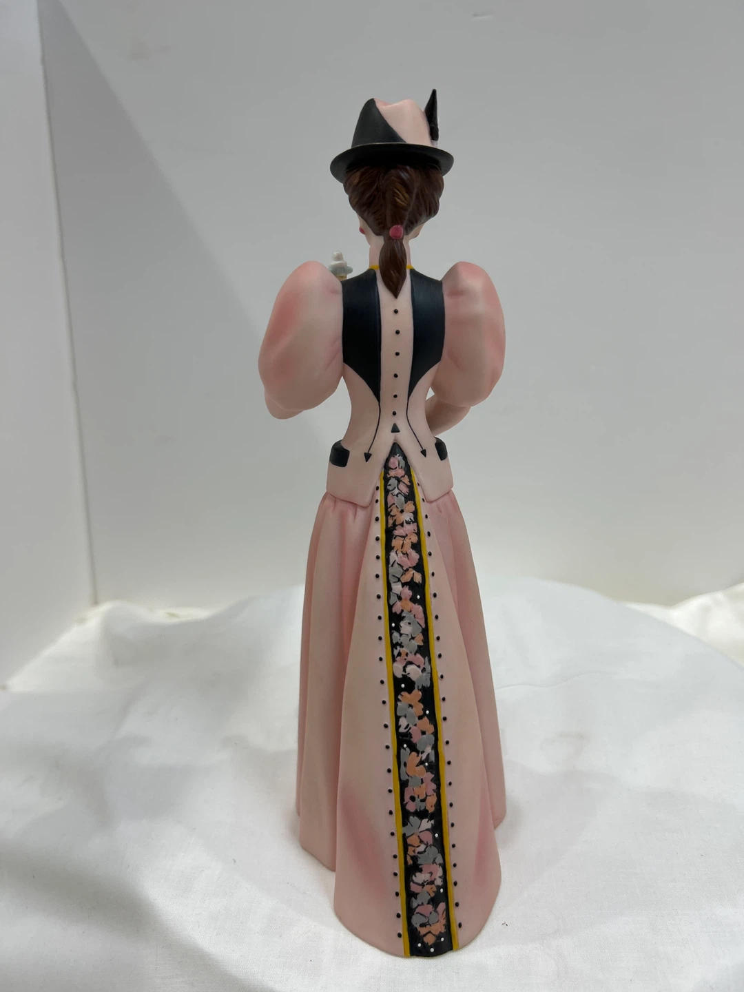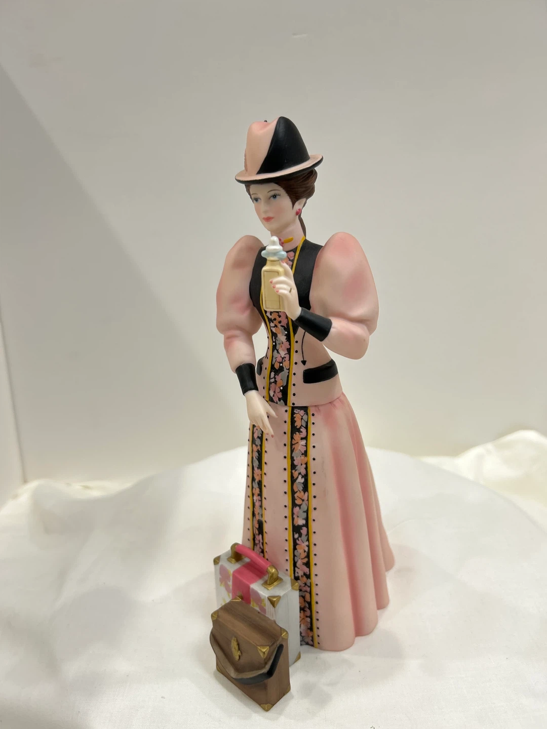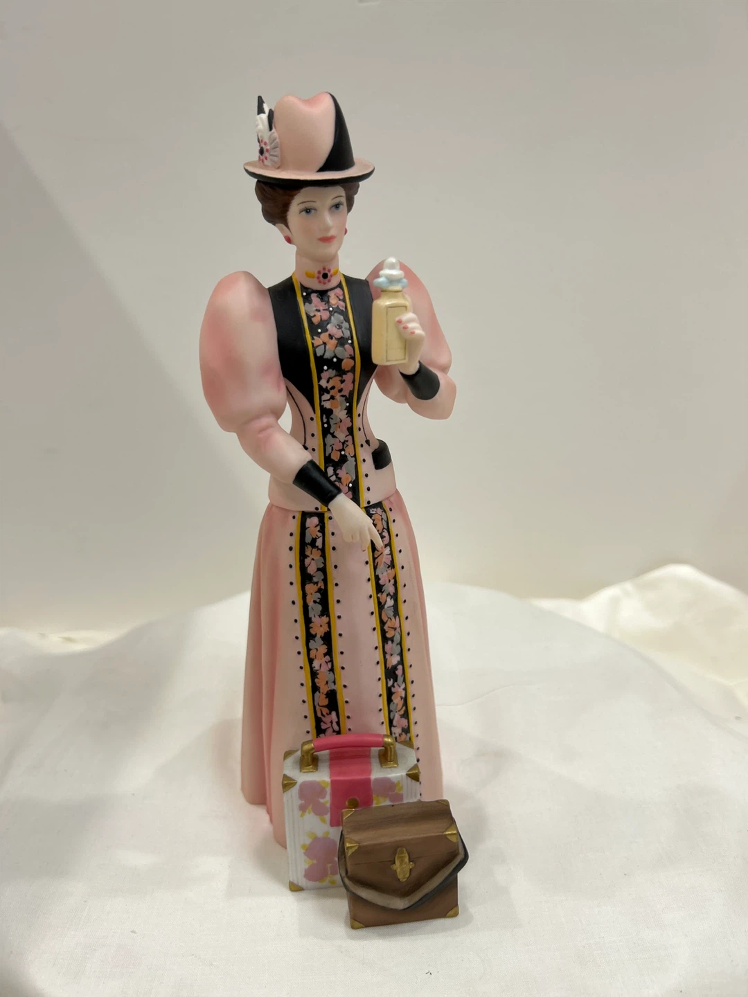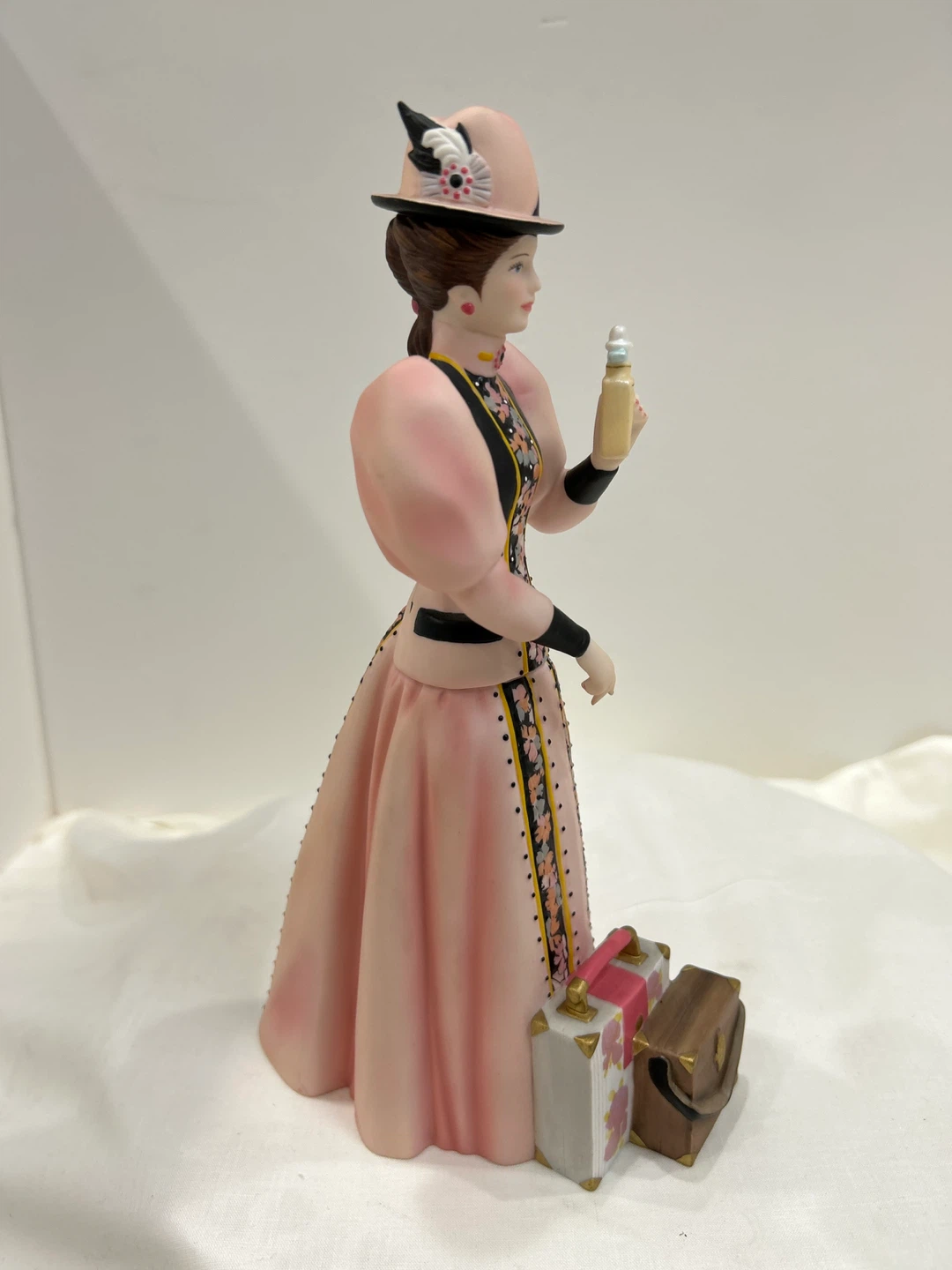 2004 Mrs Albee award porcelain collectible figurine.This charming figurine depicts a lady in a pink Victorian-style dress holding a baby bottle. It includes two miniature suitcases. A lovely decorative piece! π