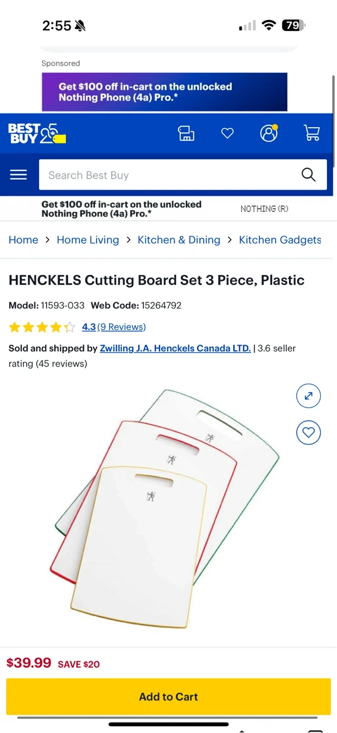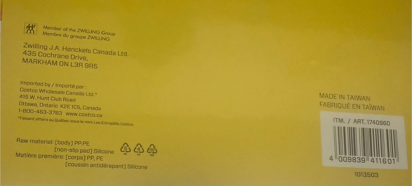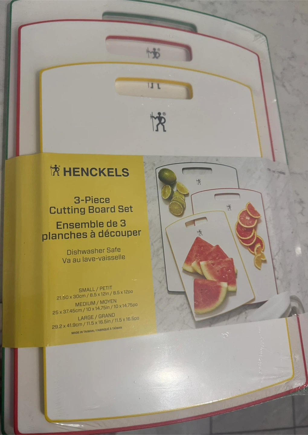 Brand NEW! This Henckels cutting board set includes small, medium, and large sizes. They're dishwasher safe and made from PP, PE with silicone non-slip pads. Made in Taiwan.