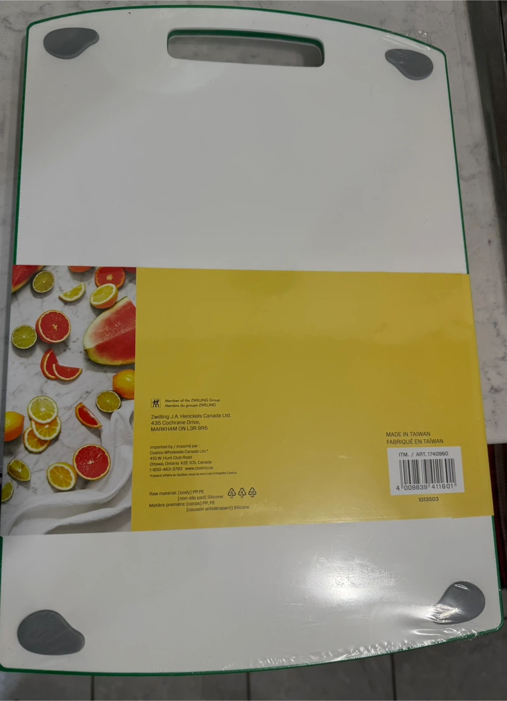Brand NEW! This Henckels cutting board set includes small, medium, and large sizes. They're dishwasher safe and made from PP, PE with silicone non-slip pads. Made in Taiwan.