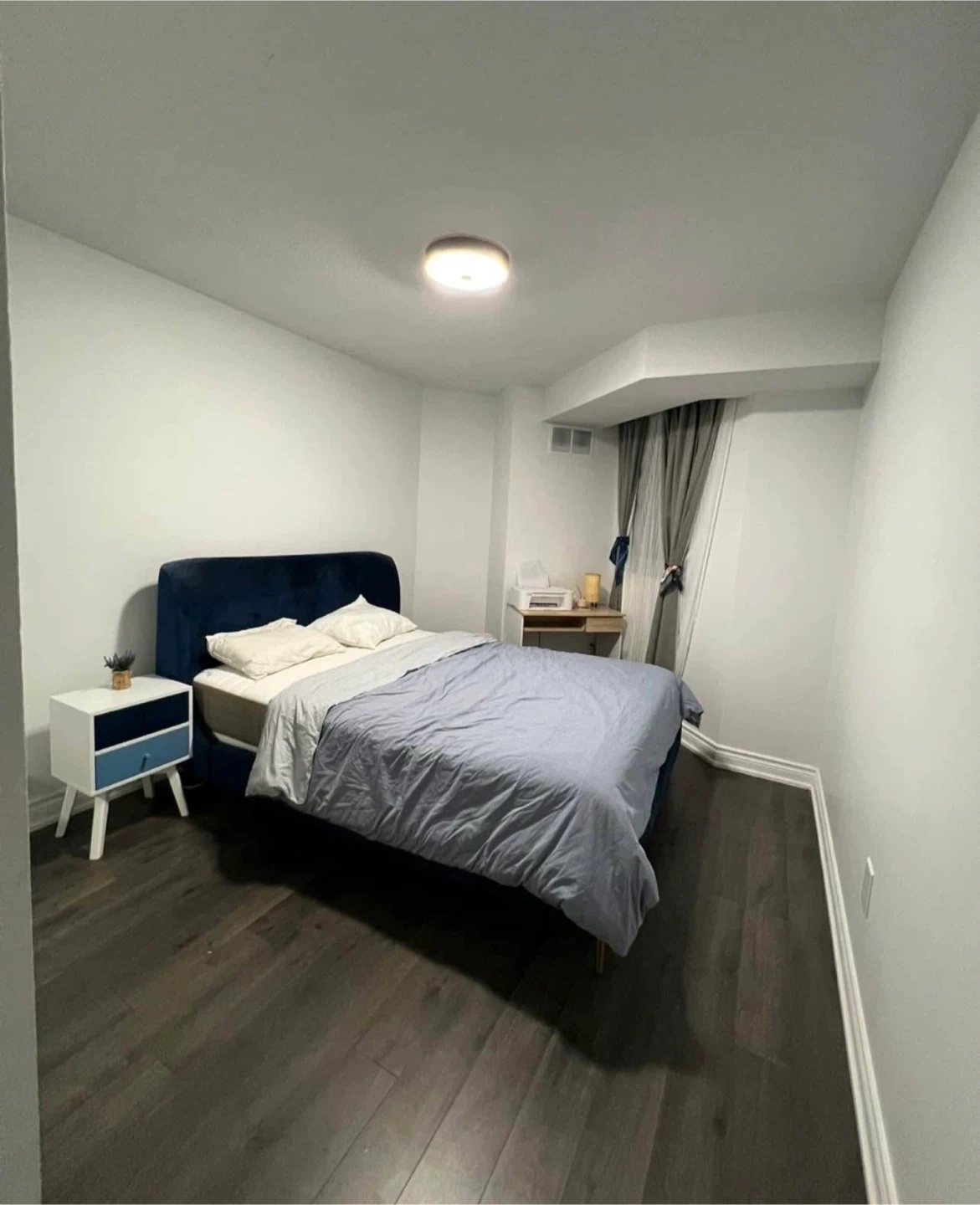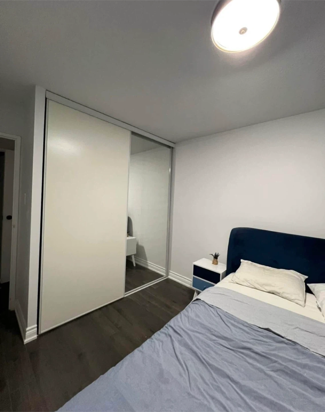 Fully furnished private room with double-size bed, desk, and closet