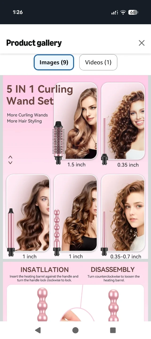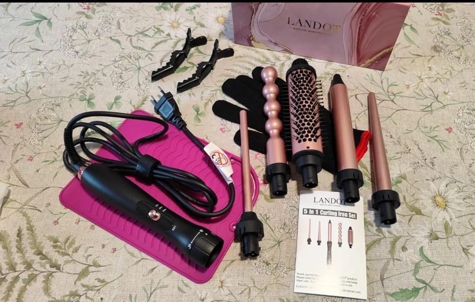 This LANDOT 5-in-1 curling iron wand set comes with multiple interchangeable barrels for various hairstyles. It includes a heating handle, a thermal brush barrel, and several curling wand attachments. A heat-resistant mat, gloves are also included.