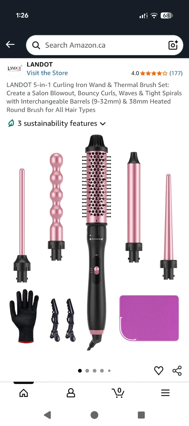 This LANDOT 5-in-1 curling iron wand set comes with multiple interchangeable barrels for various hairstyles. It includes a heating handle, a thermal brush barrel, and several curling wand attachments. A heat-resistant mat, gloves are also included.