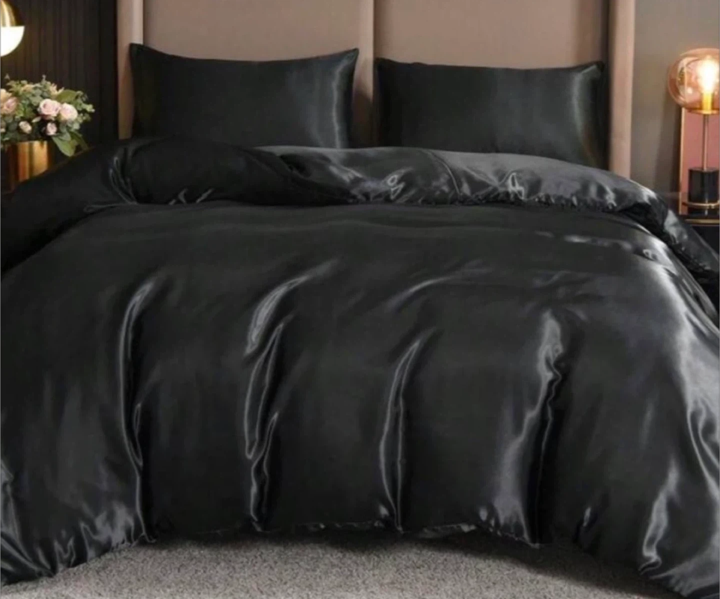 Add a touch of luxury to your bedroom with this elegant black silk bedding set! It includes a duvet cover and two pillowcases, all made from smooth, high-quality silk. The set is in great condition and will bring a sophisticated feel to any bedroom decor