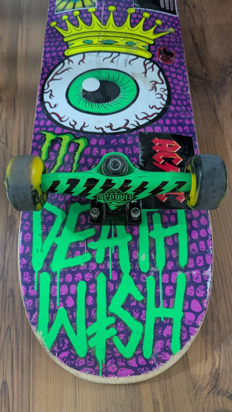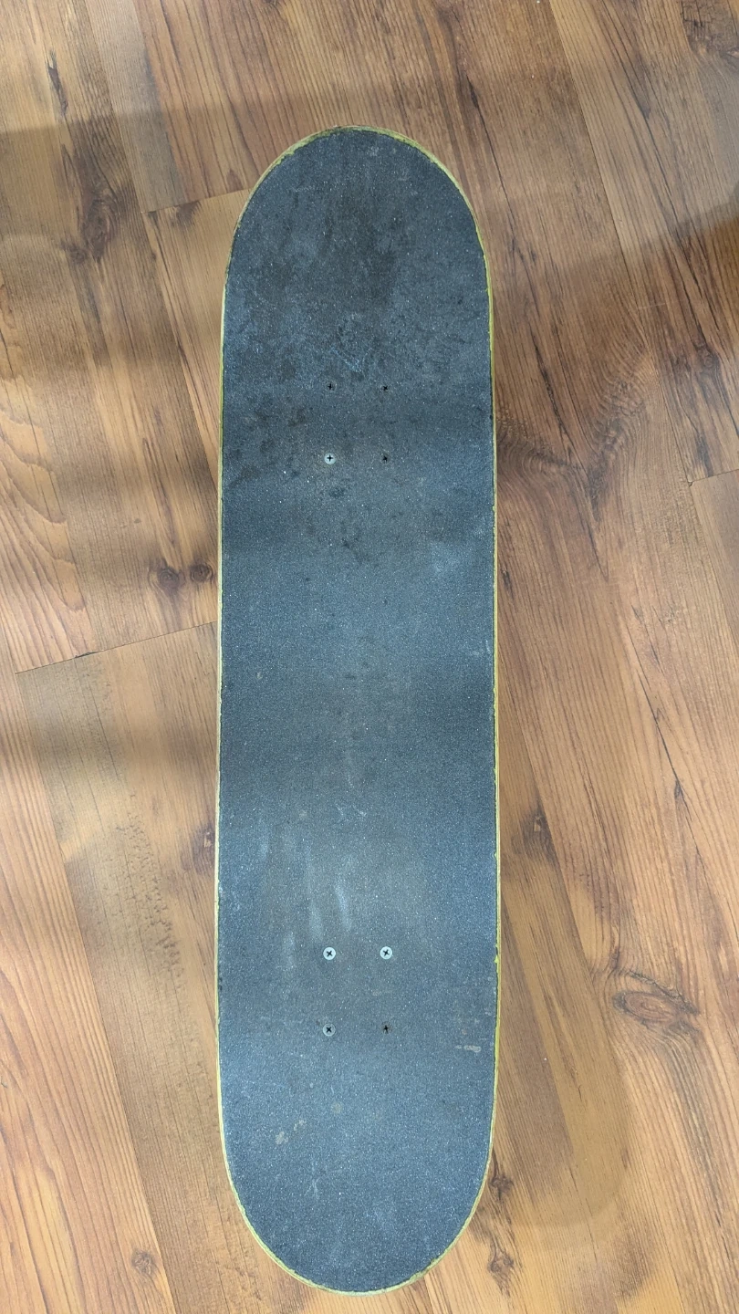 Selling a used *Rare Deck* Lizard King skateboard. It has green trucks and black wheels with yellow designs with Bones Reds bearings. Great for someone looking to get into skateboarding!