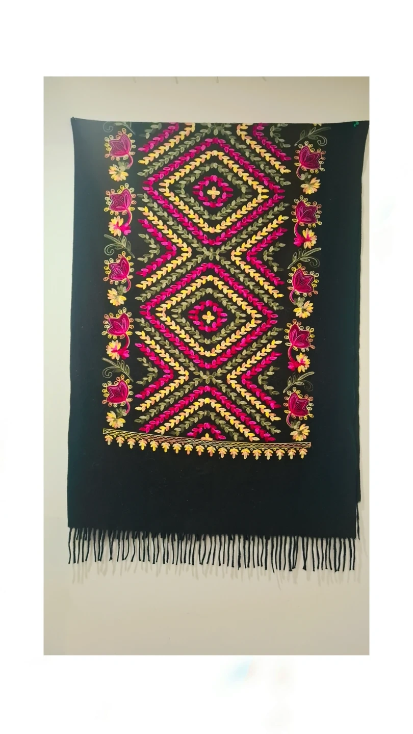 This black shawl features intricate embroidery in pink, yellow, and green. It has a fringed hem for added detail. A lovely accessory to complete an outfit!