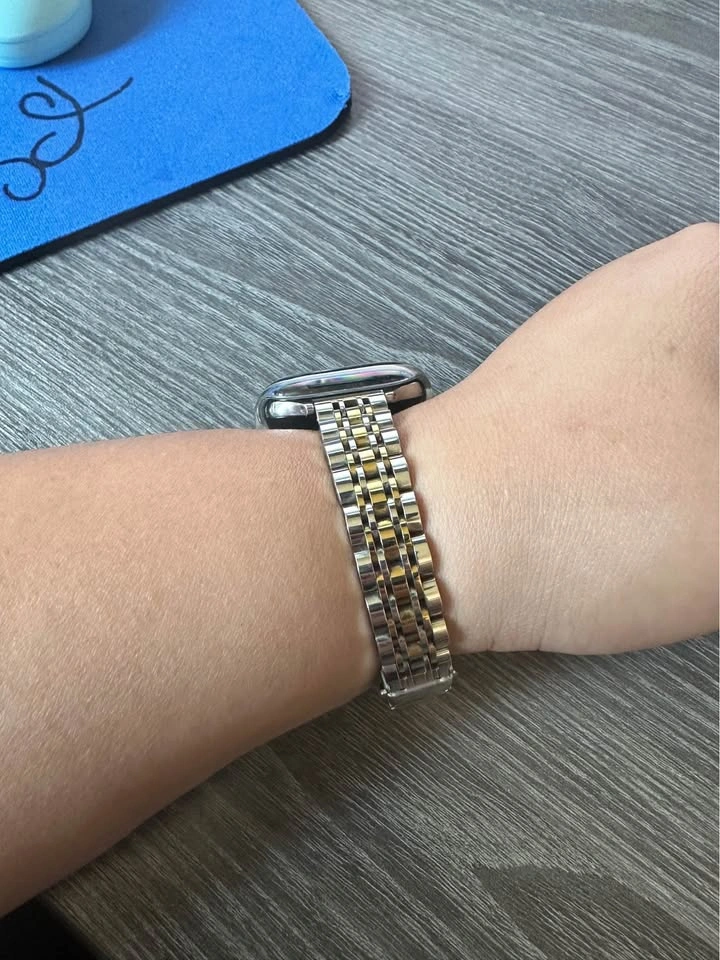 This Apple Watch was bought in Feb 2025. It's a Series 10 Aluminum, Size 42mm. It has been in a protective case since day 1. I have the Black Silicone band also but I added this gorgeous gold/silver metallic band that makes it look more elegant. This band is adjustable and comes with extra links and the tool to adjust it.