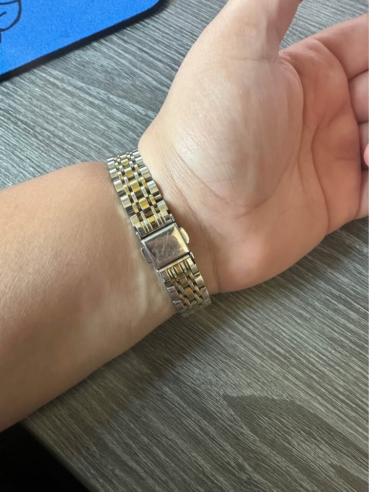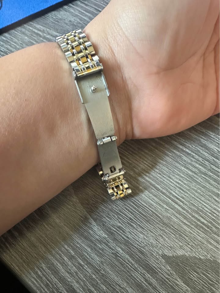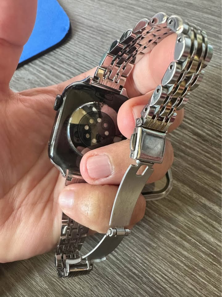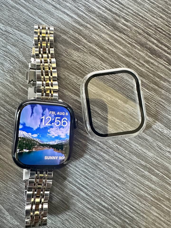 This Apple Watch was bought in Feb 2025. It's a Series 10 Aluminum, Size 42mm. It has been in a protective case since day 1. I have the Black Silicone band also but I added this gorgeous gold/silver metallic band that makes it look more elegant. This band is adjustable and comes with extra links and the tool to adjust it.